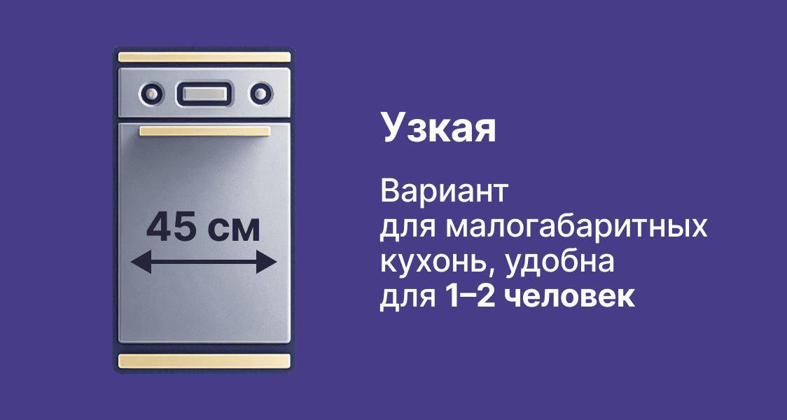 Узкая (ширина 45 см) — вариант для малогабаритных кухонь, удобна для 1-2 человек. Ее вместимость составляет около 9-10 комплектов. Однако ключевой недостаток — сложность с размещением объемной посуды. Прежде чем выбрать такую модель, честно оцените, как часто вы моете сковородки, широкие кастрюли и формы для выпечки. Покупка узкой модели для большой семьи — прямой путь к тому, чтобы мыть посуду частями и оставлять грязные кастрюли на потом, а также запускать несколько циклов подряд, что приведет к повышению расходов на коммунальные услуги.