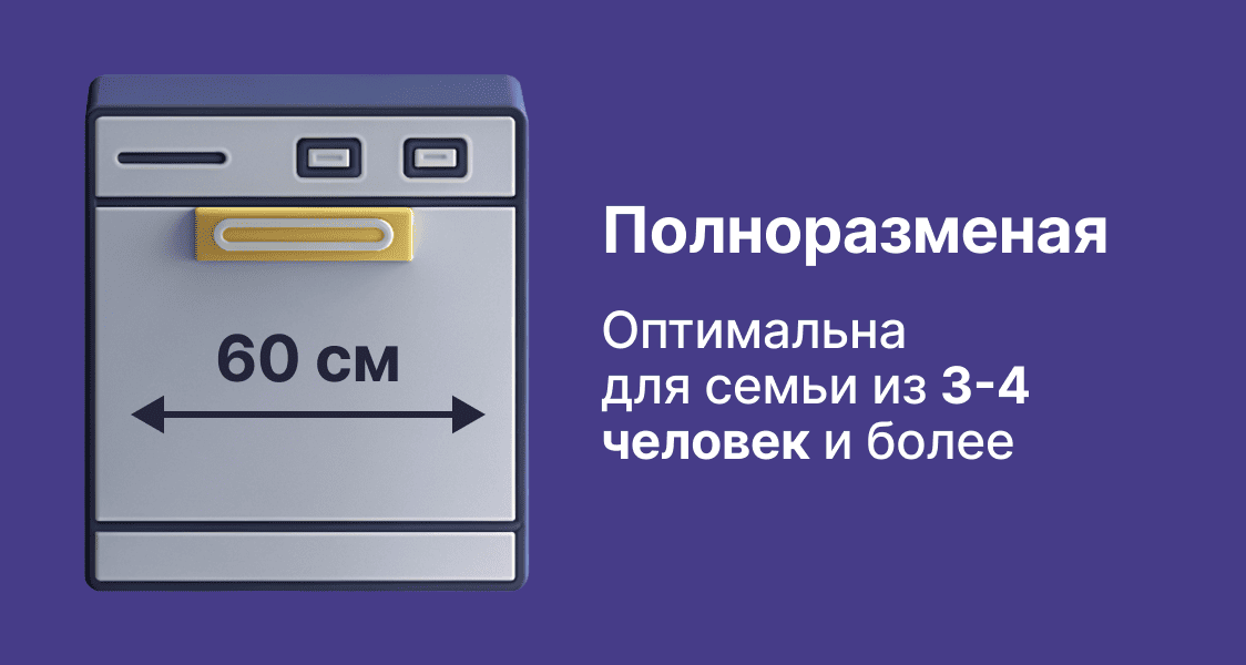 Полноразмерная модель (ширина 60 см) — оптимальна для семьи из 3-4 человек и более. Она вмещает 12-14 стандартных комплектов посуды и позволяет без труда мыть большие кастрюли, сковороды, противни. Если вы готовите часто и много, ваш выбор — эта категория. Если грязной посуды у вас немного, придется или копить ее чтобы наполнить машину, или запускать мойку чаще, а это приведет к излишним расходам воды и электроэнергии.