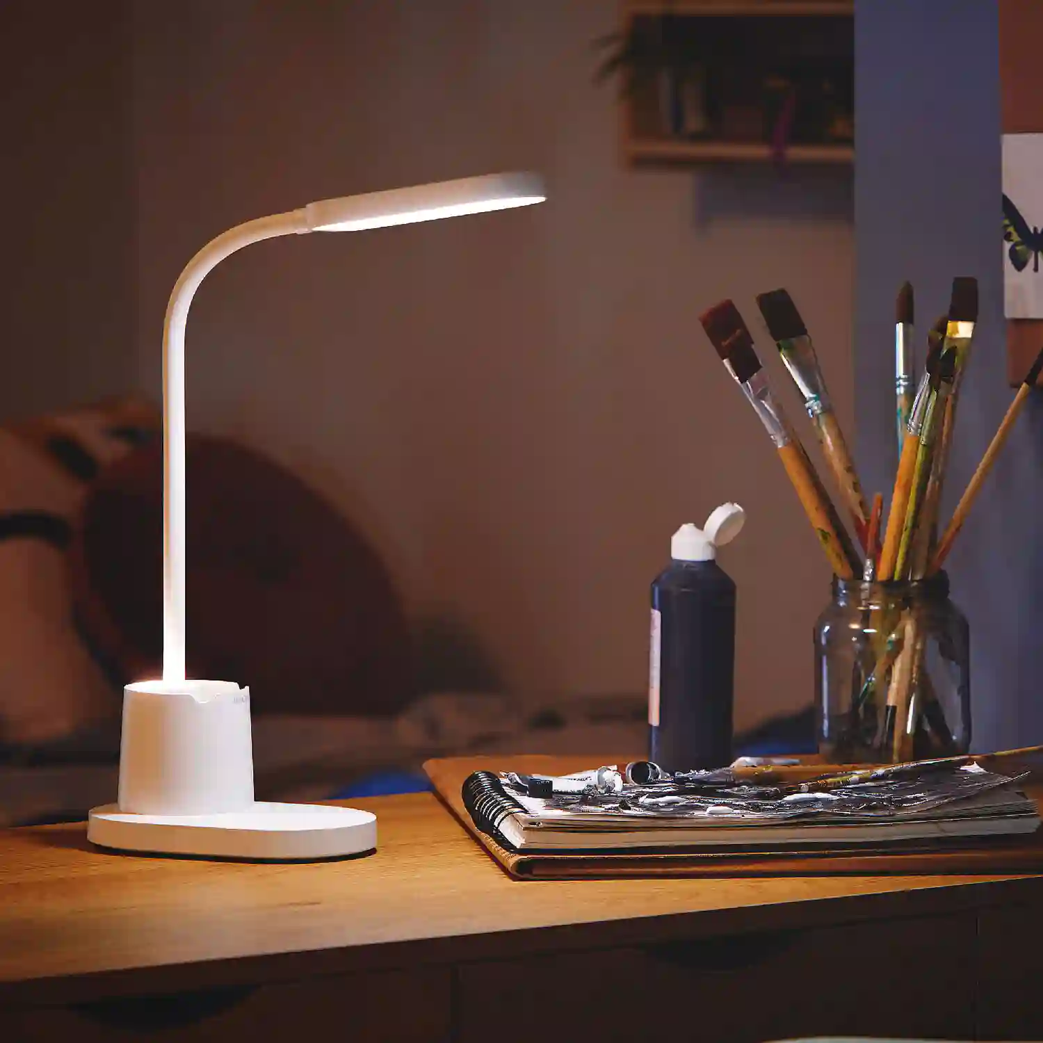 Конструкция включает подставку, которая служит пеналом для хранения ручек, карандашей и других мелких предметов. Гибкий фланец позволяет точно направлять световой поток в нужную зону и обеспечить эффективное локальное освещение без бликов.