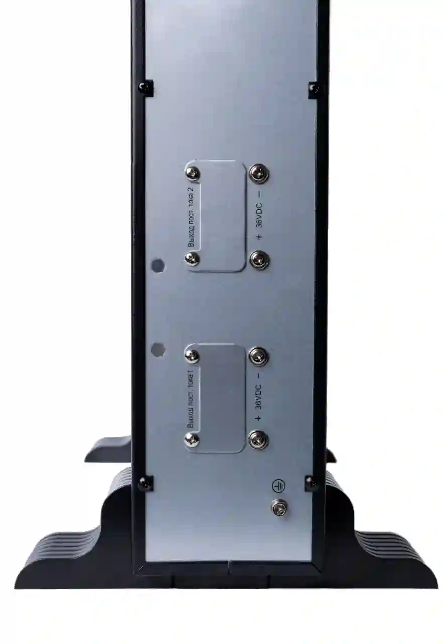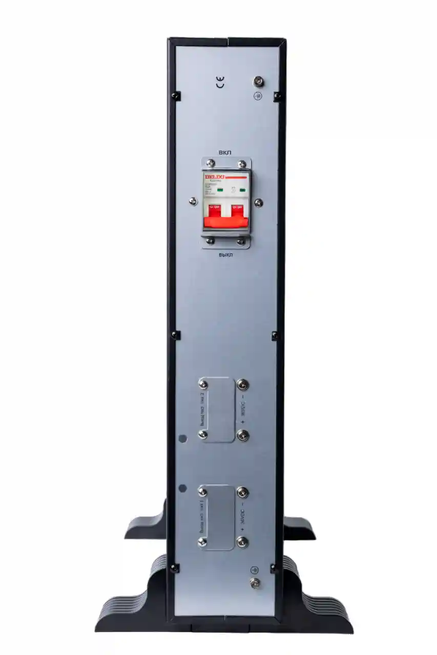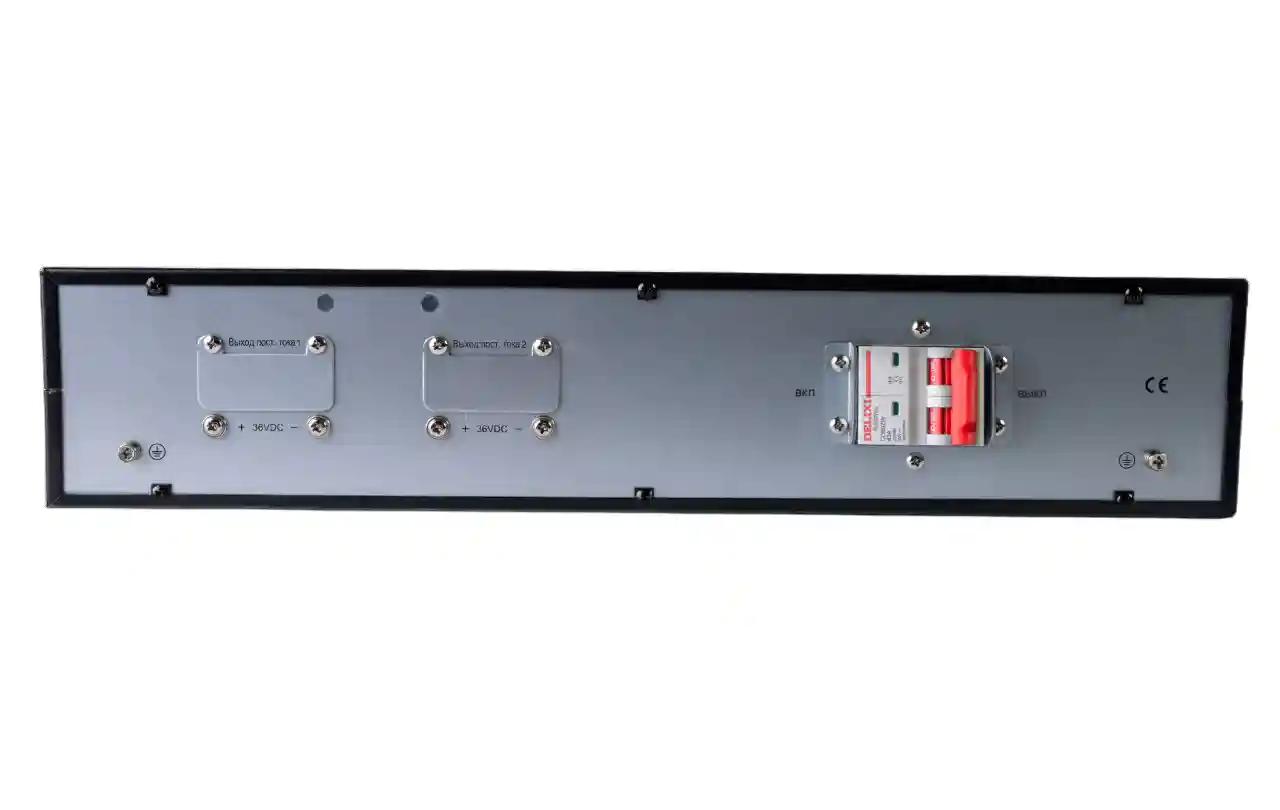 Внешний батарейный блок Systeme Electric BPSE36RT2UG2 для ИБП серии SRTSE 1K второго поколения. Внутри установлены шесть аккумуляторных батарей, каждая емкостью 12 В и 9 Ач. Общее напряжение всего батарейного массива составляет 36 В.