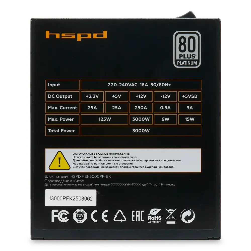 Блок питания HSPD HSI-3000PF-BK обладает мощностью 3000 Вт и сертифицирован по стандарту 80+ Platinum, что гарантирует высокую энергоэффективность и надёжность работы системы.