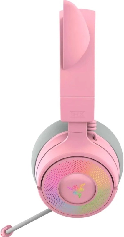 Quartz-версия привлекает нежным розовым цветом и детализированными элементами. «Ушки» и чаши оснащены Razer Chroma RGB, позволяющей настроить подсветку под стиль игрока. Гарнитура ярко смотрится в кадре, идеально подходя для стриминга.