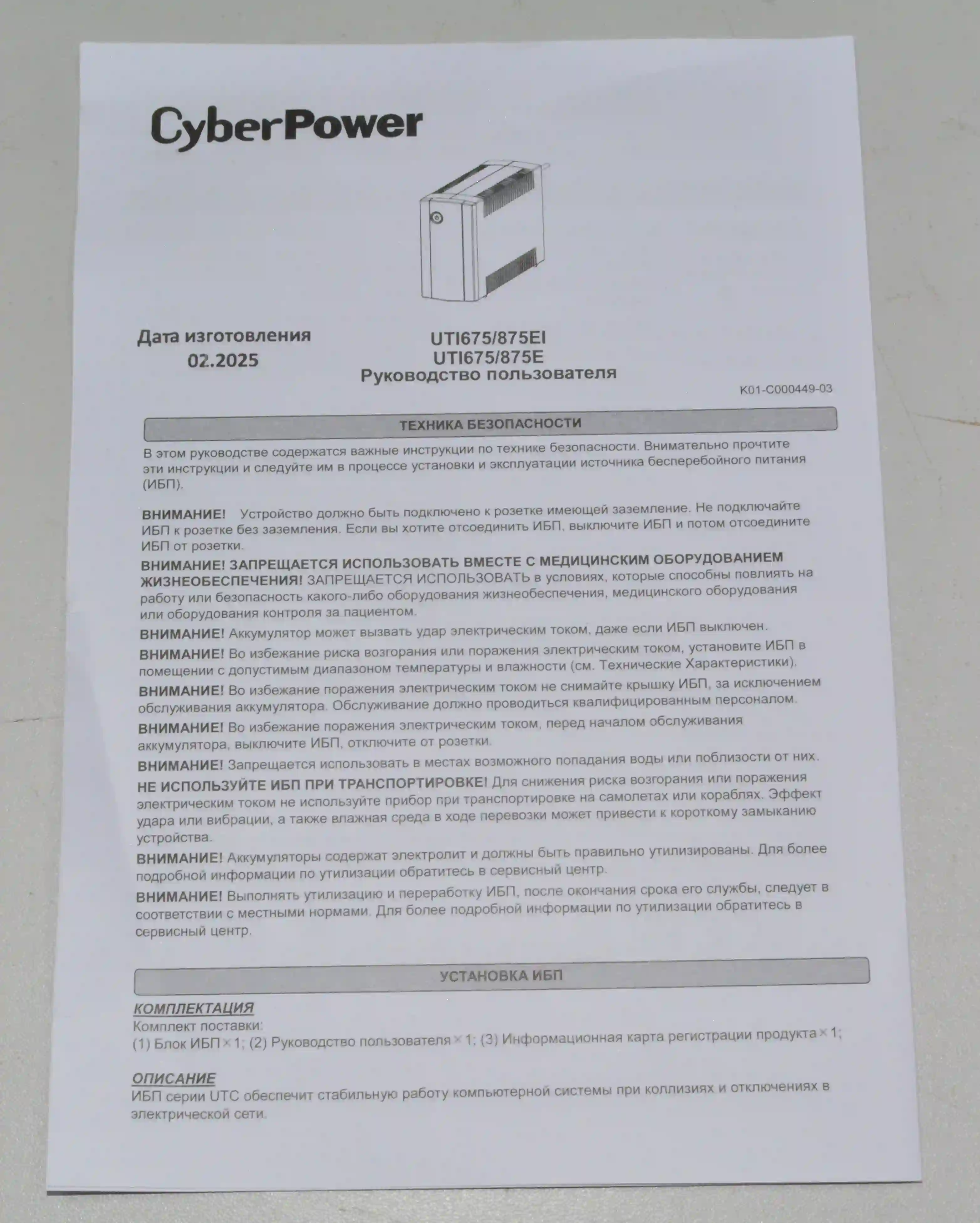 Комплектность: ИБП, документация