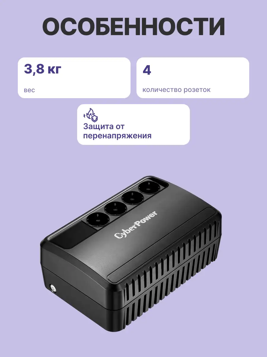 CyberPower BU850E - эта серия ИБП CyberPower предоставляет домашним и офисным пользователям надежное резервное электропитание для персональных компьютеров, сетевого, коммуникационного оборудования, и других электронных устройств от перепадов, скачков, провалов напряжения и прочих инцидентов в электроснабжении. Так как все ИБП CyberPower выполнены в корпусе из огнестойкой пластмассы, данное устройство обладает выдающимися пожаростойкими свойствами (в сравнении с аналогичной продукцией), что дает возможность минимизировать возможные повреждения ценного оборудования в случае пожара.