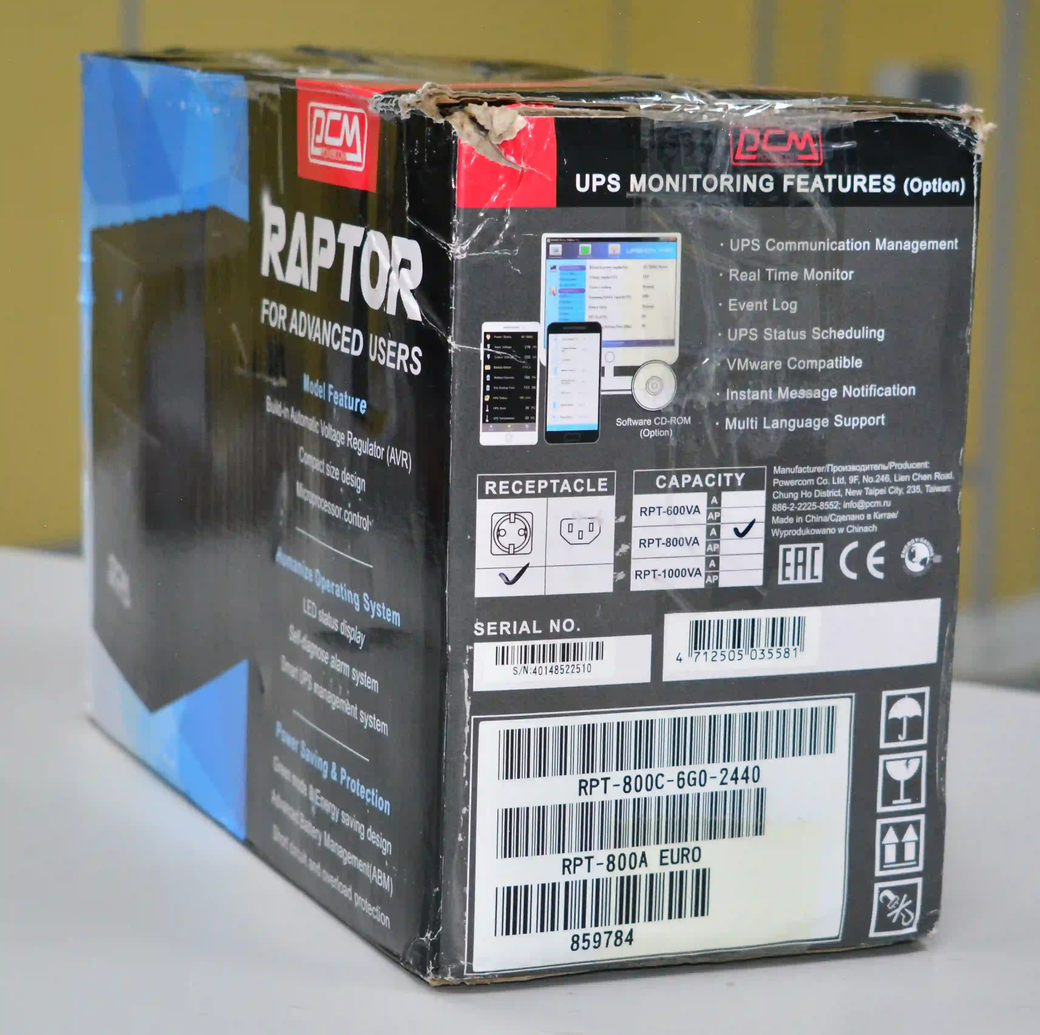 Powercom RPT-800A EURO — это линейно-интерактивный источник бесперебойного питания (ИБП) из серии RAPTOR, разработанный для защиты персональных компьютеров, периферийного и сетевого оборудования от типичных проблем с электропитанием. Устройство реагирует на перегрузки, короткие замыкания, а также на пониженное, повышенное или полное исчезновение напряжения в сети. Главная особенность модели — встроенный стабилизатор напряжения (AVR), который корректирует входное напряжение без перехода на батарею, что продлевает срок службы аккумулятора и обеспечивает стабильную работу техники в нестабильных электросетях.