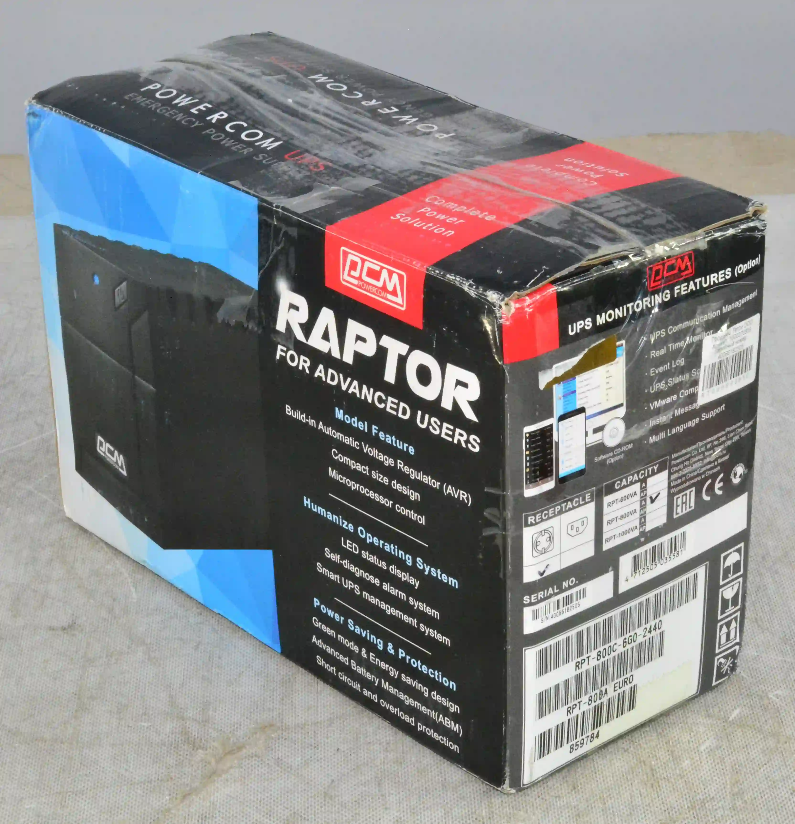 Powercom RPT-800A EURO — это линейно-интерактивный источник бесперебойного питания (ИБП) из серии RAPTOR, разработанный для защиты персональных компьютеров, периферийного и сетевого оборудования от типичных проблем с электропитанием. Устройство реагирует на перегрузки, короткие замыкания, а также на пониженное, повышенное или полное исчезновение напряжения в сети. Главная особенность модели — встроенный стабилизатор напряжения (AVR), который корректирует входное напряжение без перехода на батарею, что продлевает срок службы аккумулятора и обеспечивает стабильную работу техники в нестабильных электросетях.