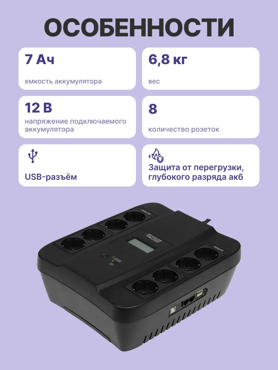 Встроенный стабилизатор напряжения (AVR) поддерживает выходное напряжение в пределах нормы, не используя ресурс аккумулятора при колебании напряжения электросети. Коммуникационный порт USB для связи с компьютером позволит своевременно завершить работу системы с сохранением данных. Функция холодного старта дает возможность включить оборудование даже при отсутствии напряжения в сети. Горячая замена АКБ обеспечивает возможность безопасной замены отработавших свой ресурс батарей без отключения ИБП и нагрузки. Данная модель оснащена USB-портом зарядки 2.4 А для подключения зарядки телефона или других девайсов. В комплект также входит кабель-менеджер, предназначенный для удобства размещения шнуров подключаемого к ИБП оборудования.