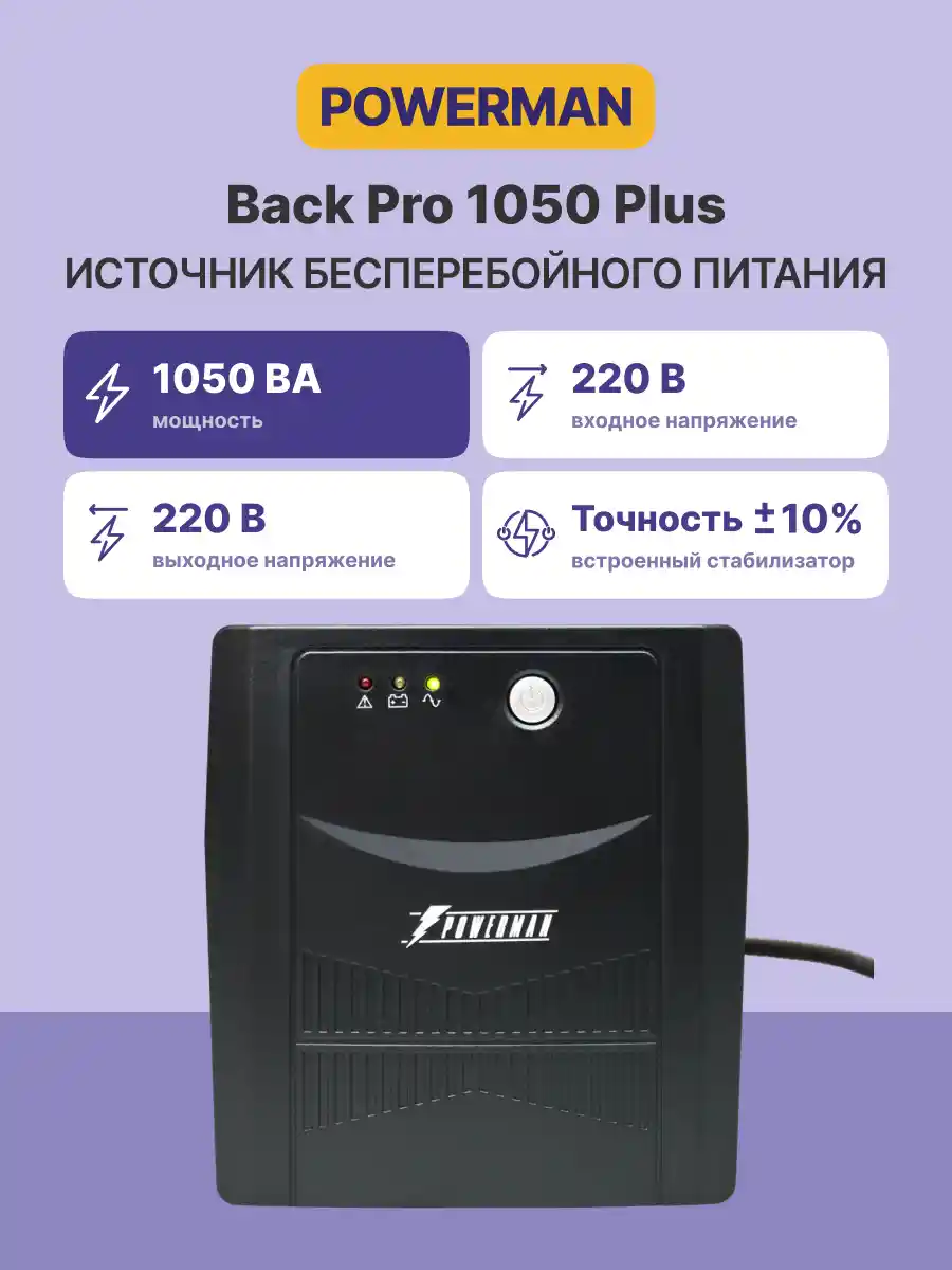 POWERMAN Back Pro 1050 Plus - линейно-интерактивный ИБП мощностью 1050ВА. Обеспечит надежную защиту различной нагрузке небольшой мощности с импульсным блоком питания при полном отключении электросети, а также при работе сети с отклонениями от нормы: пониженным либо повышенным уровнем напряжения, наличием импульсных и высокочастотных помех.