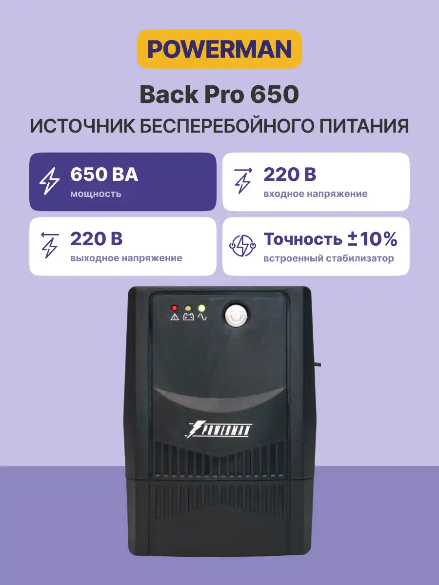 POWERMAN Back Pro 650 Plus - линейно-интерактивный ИБП мощностью 650ВА. Обеспечит надежную защиту ПК, рабочей станции, небольшого сервера, коммуникационного оборудования либо другой нагрузки небольшой мощности с импульсным блоком питания при полном отключении электросети, а также при работе сети с отклонениями от нормы: пониженным либо повышенным уровнем напряжения, наличием импульсных и высокочастотных помех.