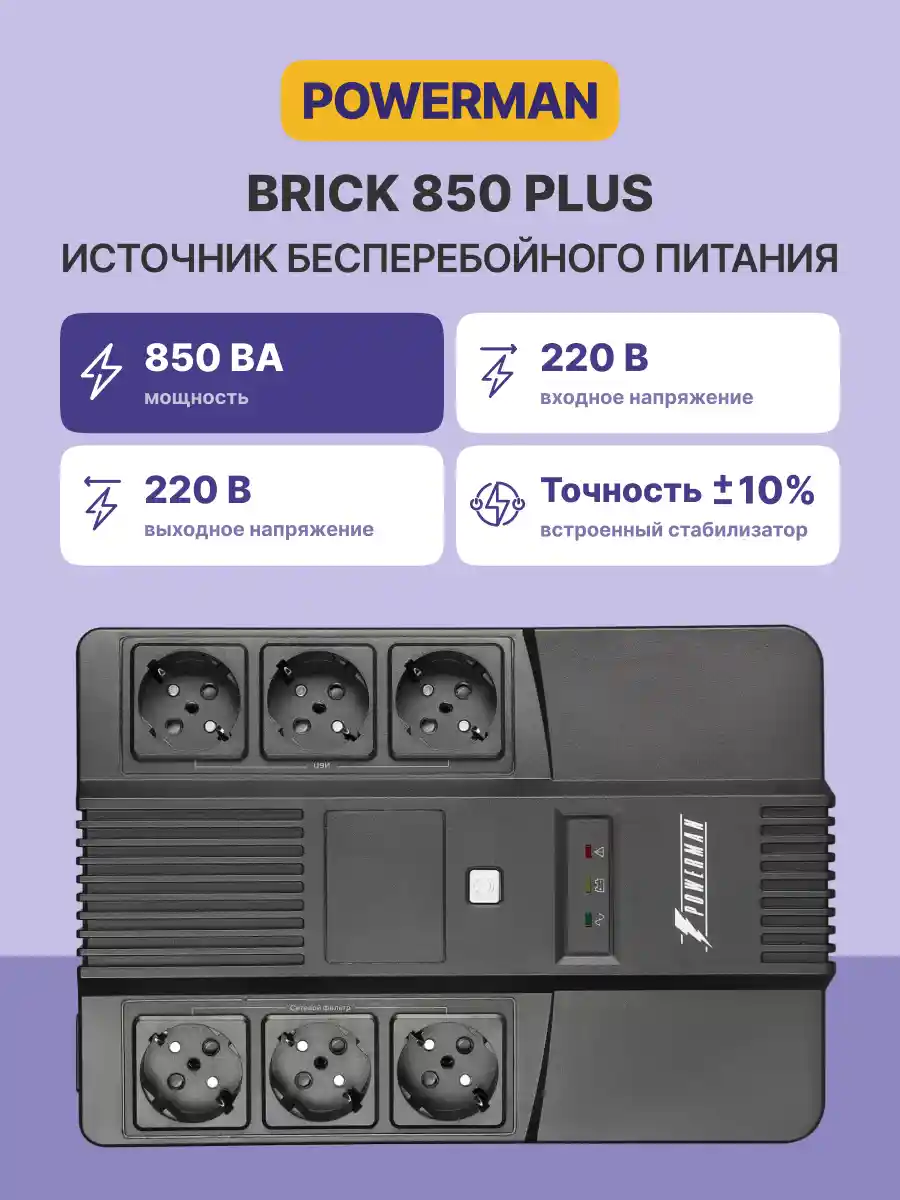 ИБП POWERMAN Brick 850 Plus сочетает в себе функции ИБП, регулятора напряжения и сетевого фильтра. Дизайн корпуса позволяет размещать устройство как в горизонтальном положении на поверхности пола или стола, так и в навесном.