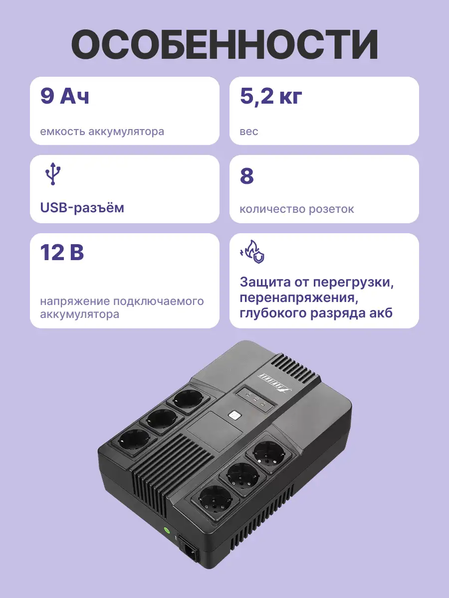 - Мощность 850 ВА/480 Вт.