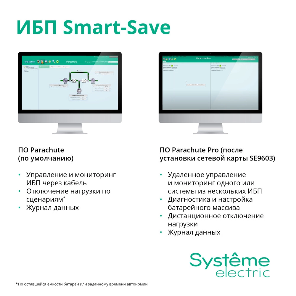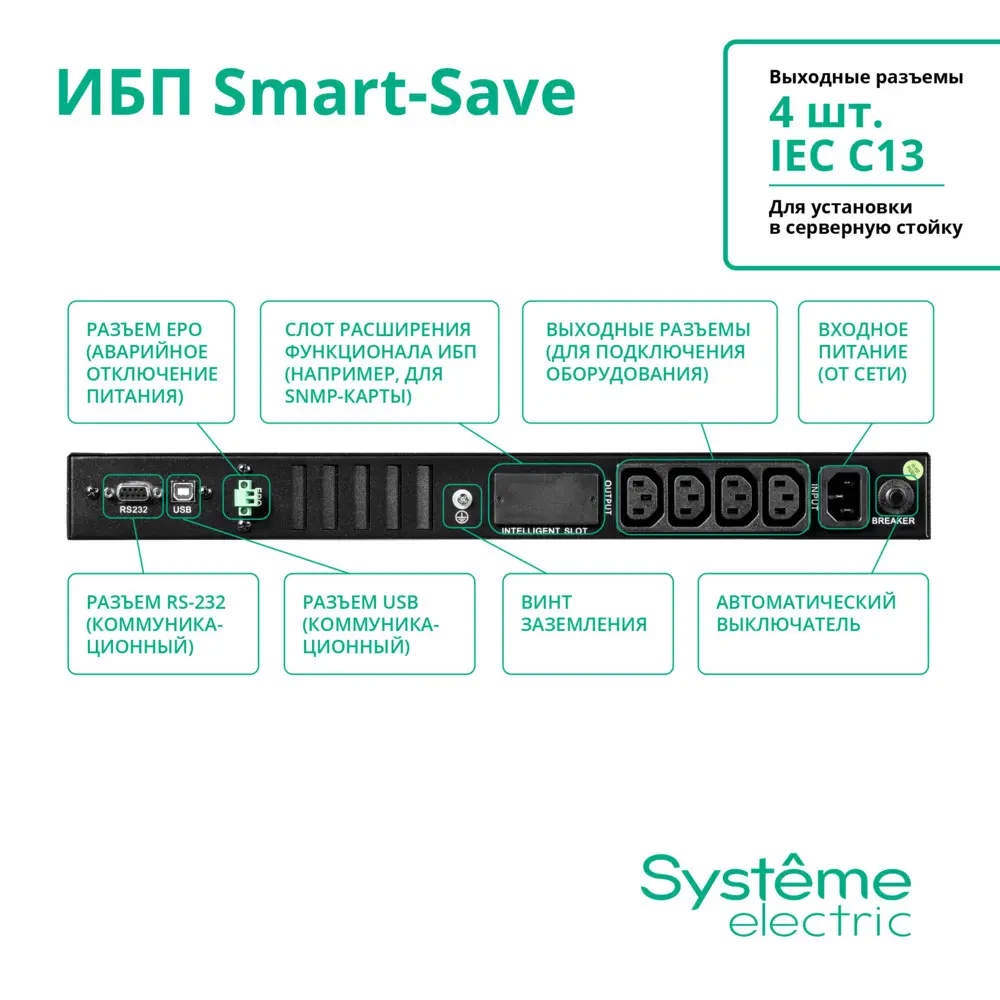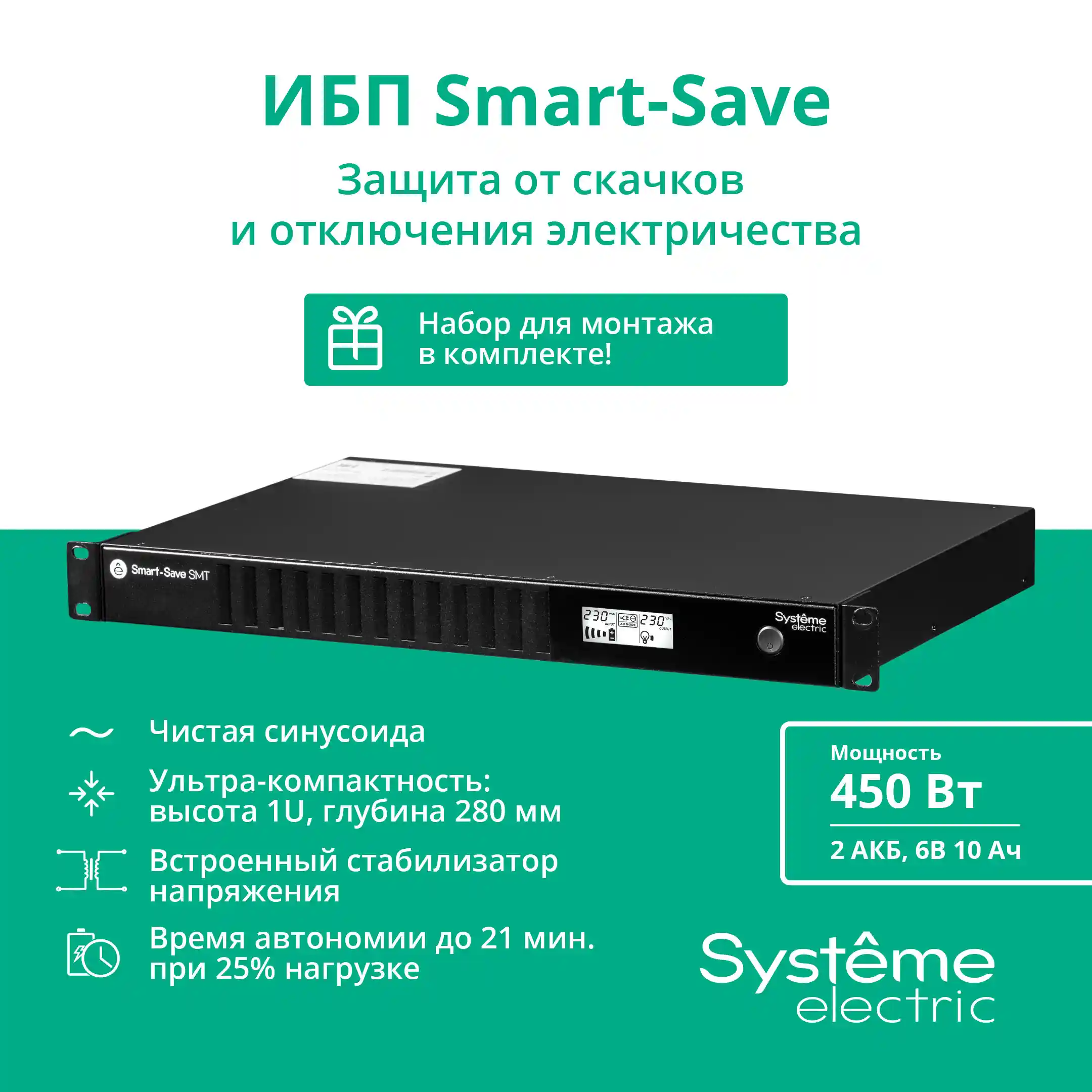 Smart-Save SMT - однофазные источники бесперебойного питания. Защита питания для серверного, сетевого и телекоммуникационного оборудования начального уровня для размещения в 19” шкафах. ИБП серии Smart-Save SMT - оптимальная система защиты от всплесков напряжения и батарейного резервного питания для сравнительно несложных конфигураций. Также подходят для магазинов розничной торговли, малых и средних предприятий. Компактные размеры позволяют разместить ИБП в навесных или напольных шкафах небольшой глубины. Имеет USB-порт и последовательный порт для интеграции ИБП и сервера с помощью программного обеспечения, позволяющего настроить автоматическое выключение сервера при низком остатке заряда батареи. ИБП оснащен слотом для установки опциональных коммуникационных карт: SNMP, сухие контакты, Modbus.