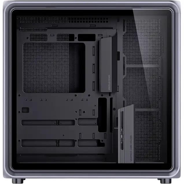 Максимальная длина видеокарты может достигать 435 мм, а для надежной фиксации тяжелых моделей в комплекте предусмотрен специальный держатель. Процессорные кулеры могут быть высотой до 173 мм, блок питания формата ATX длиной до 200 мм устанавливается сверху. Накопители размещаются в двух конвертируемых отсеках для устройств 3,5 дюйма и 2,5 дюйма, а также в двух дополнительных отсеках 3,5 дюйма, которые располагаются продольно и имеют вертикальное крепление, что облегчает прокладку кабелей.