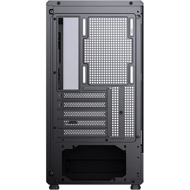 В корпусе предусмотрены три отсека для SSD 2,5 дюйма и два HDD (поперечных) размером 3,5 дюйма. Нижнее расположение блока питания ATX длиной до 170 мм оптимизирует распределение воздушных потоков. Предусмотрено пространство для видеокарт длиной до 410 мм. Пять слотов расширения позволяют установить видеокарты, звуковые карты, сетевые адаптеры и другие комплектующие.