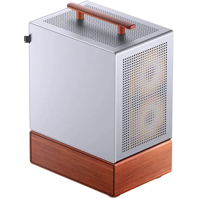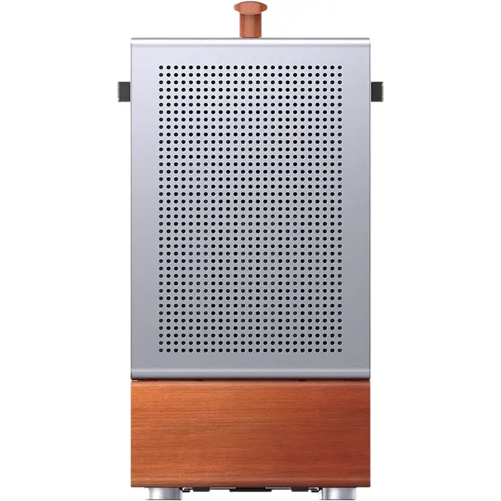 Корпус выполнен в лаконичном стиле из алюминиевого сплава толщиной 3 мм и стали. Элегантность внешнего вида подчеркивается аккуратной перфорацией, основанием и ручкой из массива североамериканского ореха. Правую боковую панель из закаленного стекла можно заменить на металлическую, что удобно для персонализации внешнего облика устройства.