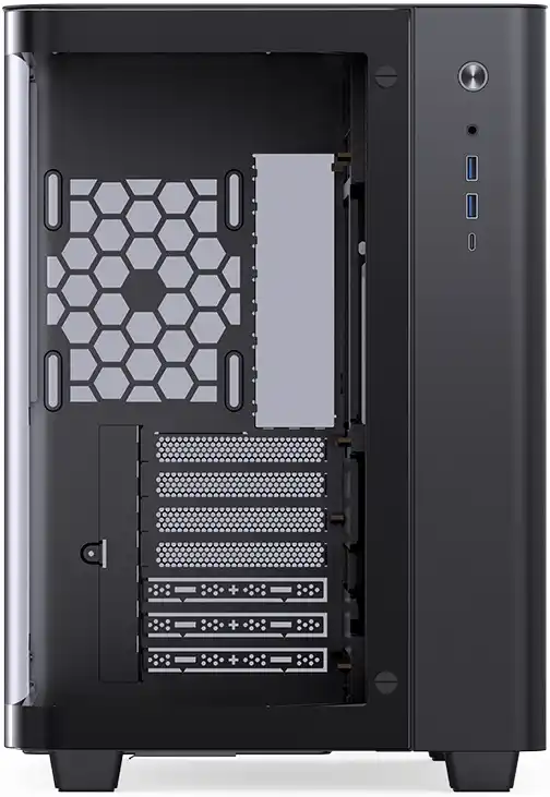 Корпус ATX JONSBO TK-3 отличается вертикальным расположением перегородок. Отсек, расположенный слева, оснащённый просторным лотком для материнской платы, не имеет вертикальных слотов расширения. Однако в нём достаточно места даже для самой крупногабаритной видеокарты.