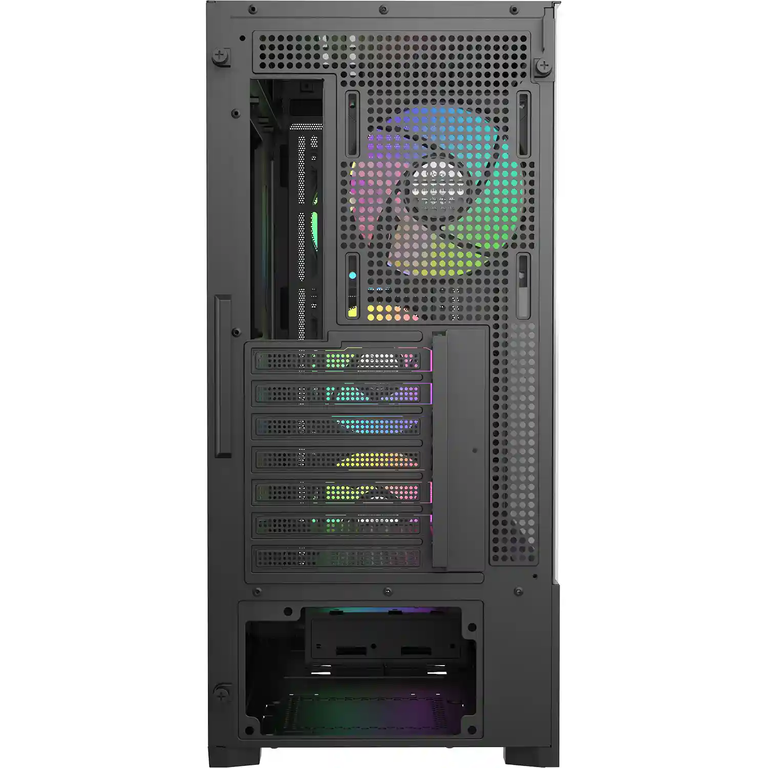 Передняя панель оснащена ультратонкой, высокопрозрачной металлической сеткой в сочетании с полностью перфорированным кожухом блока питания, что создает эффективную систему вентиляции. Это значительно снижает температуру области видеокарты, обеспечивая стабильную работу при длительных высоких нагрузках. Полностью перфорированный кожух блока питания повышает эффективность охлаждения видеокарты. Подсветка ARGB в левом нижнем углу панели из закаленного стекла добавляет нотку технологичной эстетики. Динамичная передняя панель с логотипом бренда создает современный и стильный вид. Верхняя панель поддерживает радиаторы до 360 мм, что соответствует требованиям высокопроизводительных конфигураций охлаждения. Сетчатая конструкция передней панели обеспечивает эффективный воздушный поток. Максимальная производительность: совместимость с вентиляторами ARGB, радиаторами 360 мм и видеокартами. Широкая совместимость: совместимость с материнскими платами EATX/ATX/M-ATX/ITX и высокопроизводительными комбинациями оборудования. Скрытая конструкция портов ввода/вывода обеспечивает чистый и минималистичный внешний вид.