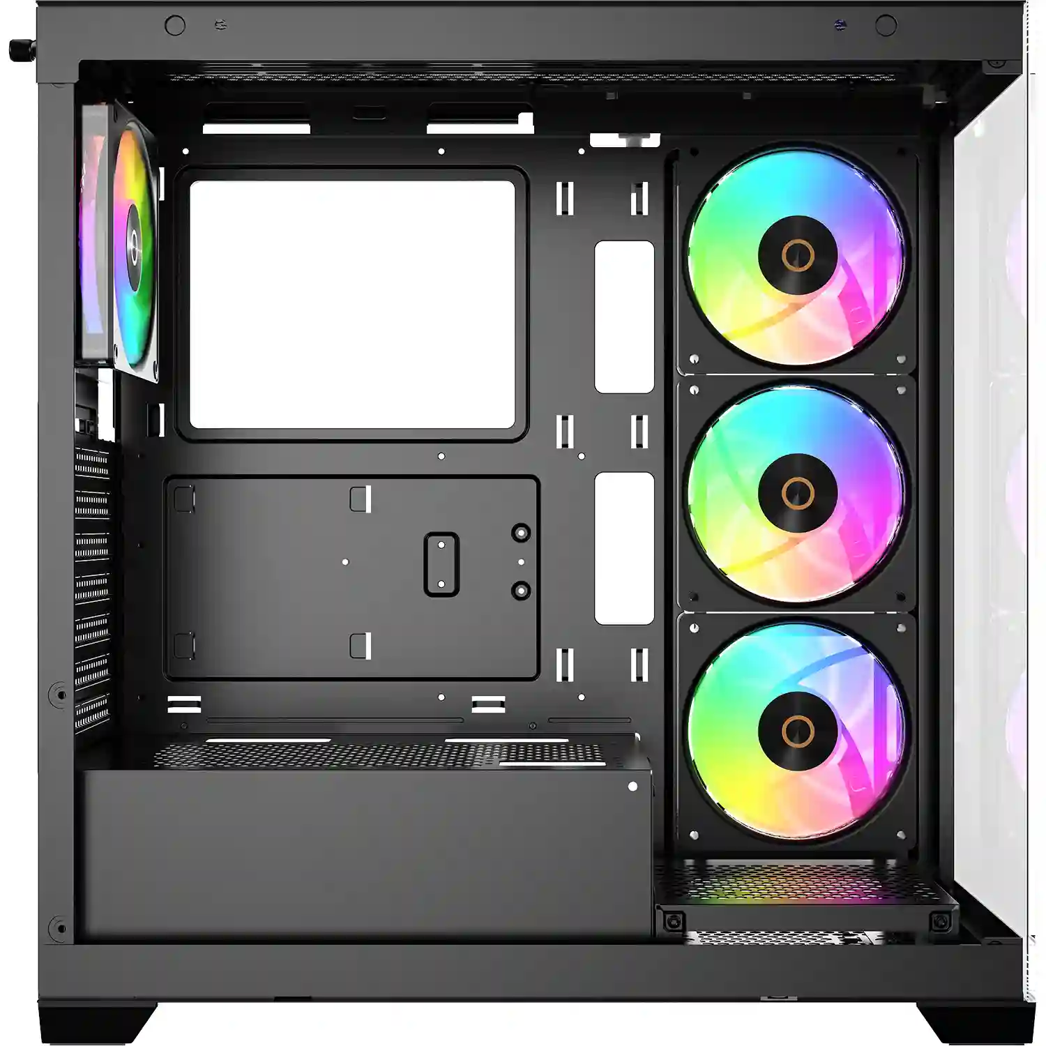 Захватывающий панорамный обзор с улучшенной эффективностью охлаждения. Безрамочная конструкция с двойными панелями из 4-мм закаленного стекла высокой прозрачности демонстрирует внутренние компоненты корпуса, создавая захватывающий визуальный эффект как внутри, так и снаружи. Оптимально размещенные точки крепления для охлаждающих компонентов и продуманная система воздушного потока корпуса обеспечивают высокую циркуляцию воздуха, повышая эффективность охлаждения и раскрывая мощность вашей системы. Умное расположение пространства внутри корпуса позволяет устанавливать комплектующие больших размеров, обеспечивая легкость в сборке даже для высокопроизводительных систем. Верхняя панель поддерживает установку радиаторов до 360 мм, видеокарт длиной до 425 мм и блоков питания до 250 мм. Магнитные пылевые фильтры на верхней и нижней панелях эффективно защищают от попадания пыли. В комплекте — четыре предустановленных 120-мм ARGB PWM вентилятора.