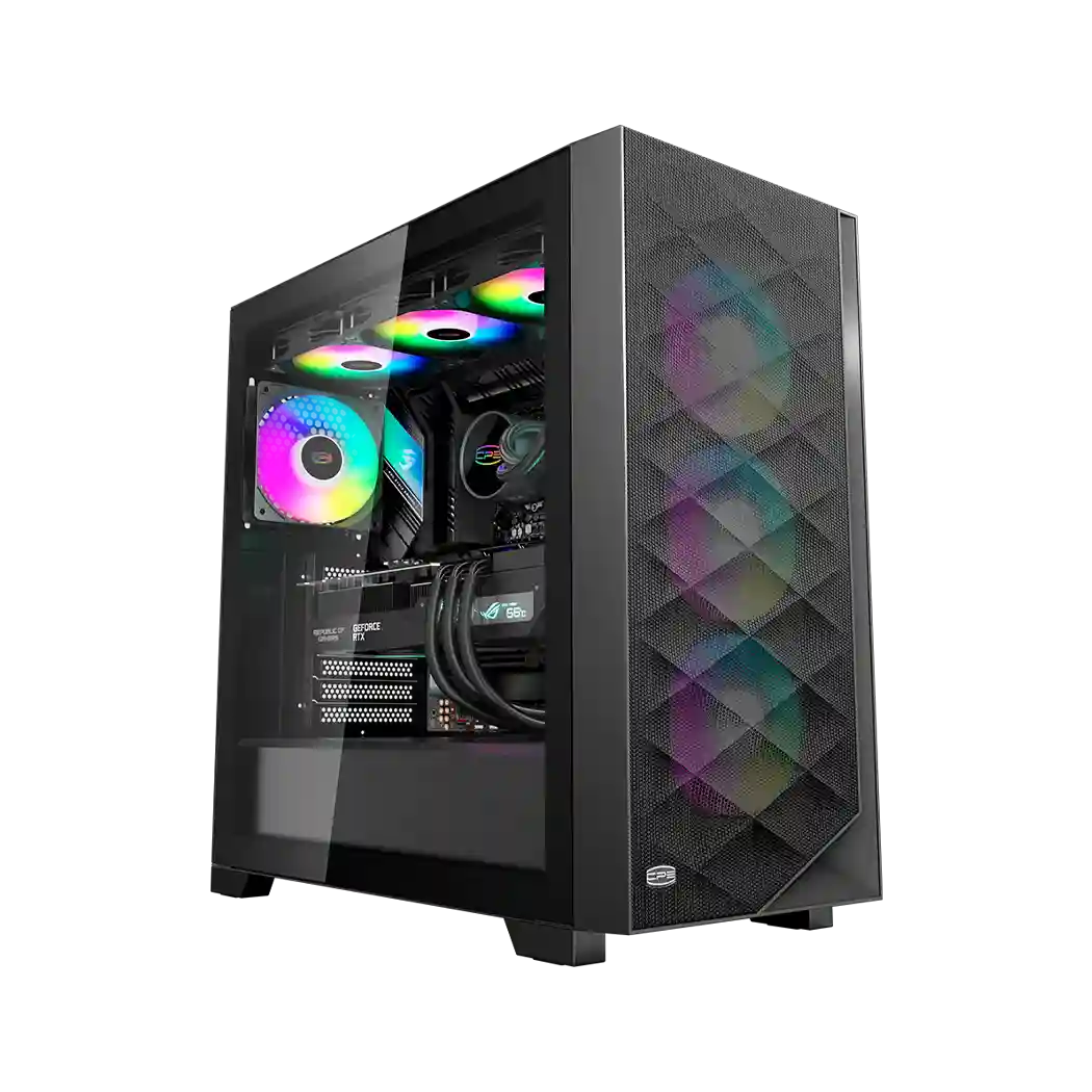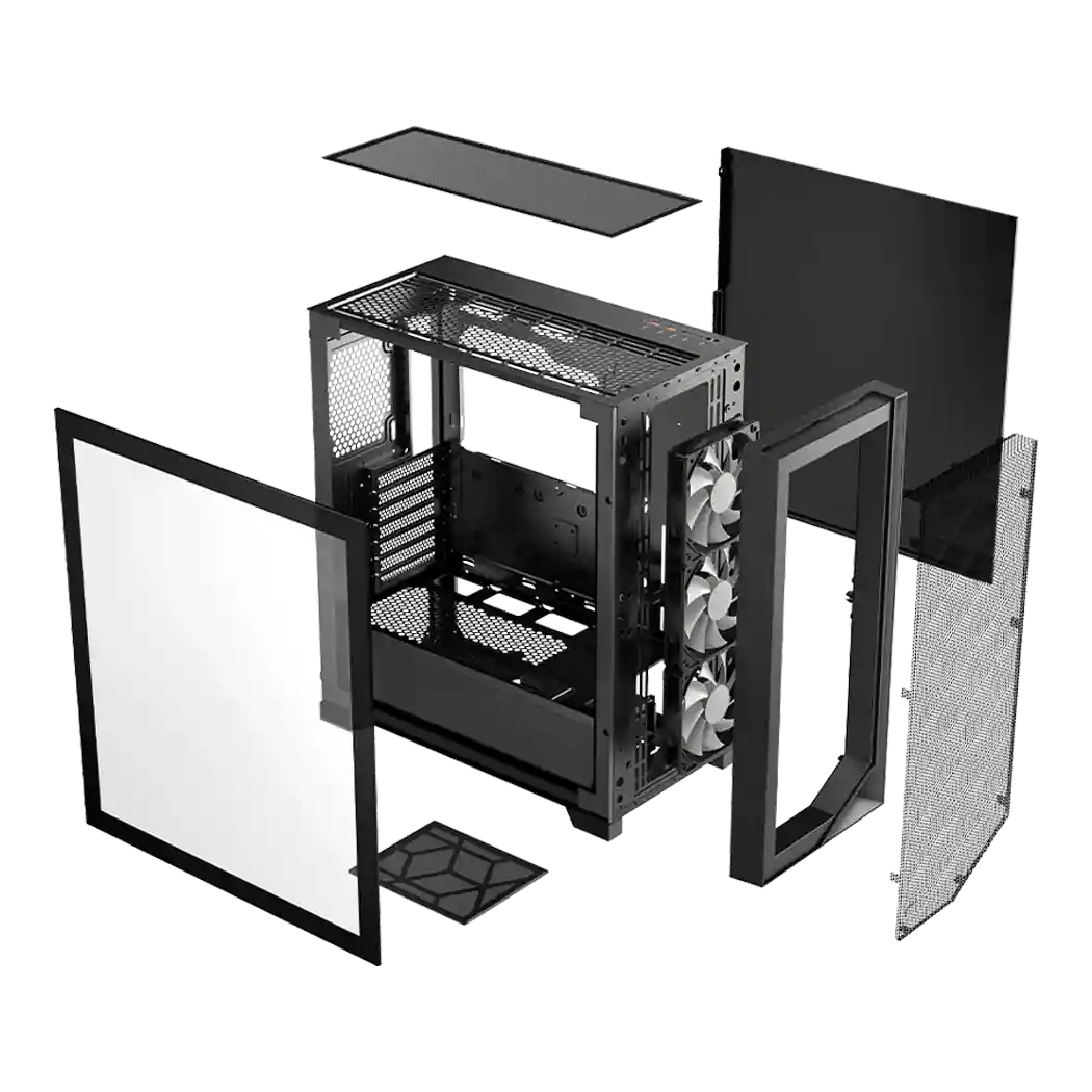Корпус оснащен тремя предустановленными вентиляторами диаметром 120 мм с ARGB подсветкой, что не только улучшает внешний вид системы, но и способствует эффективному охлаждению. Дополнительные возможности для установки вентиляторов обеспечивают улучшенную вентиляцию, помогая поддерживать низкую температуру всех компонентов, даже при высоких нагрузках.