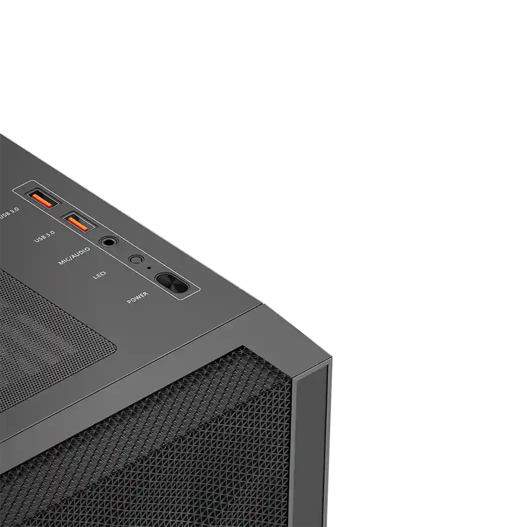 На передней панели корпуса расположены удобные порты для подключения различных устройств. Здесь есть два порта USB 3.0, что обеспечивает легкий доступ к необходимым интерфейсам. Это добавляет удобства в повседневное использование и позволяет легко подключать периферийные устройства, такие как внешние накопители или клавиатуры.