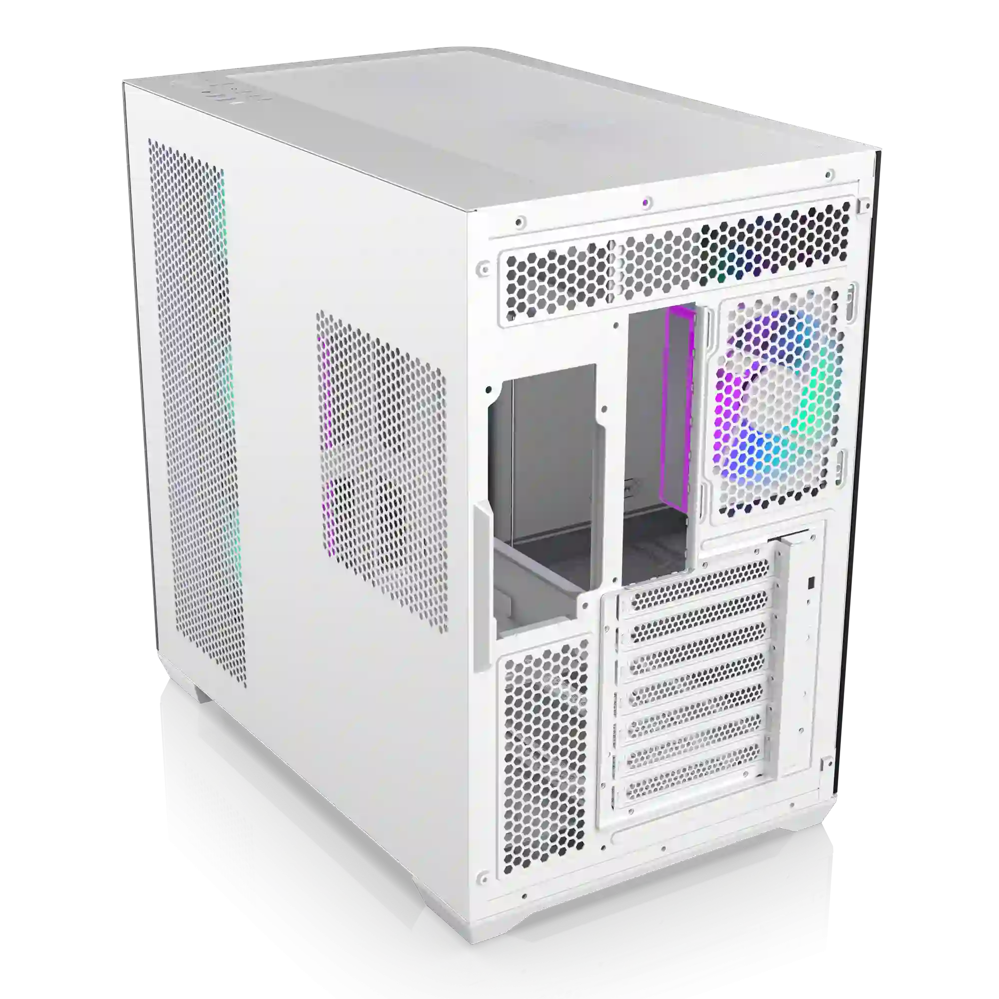 В комплект входит 7 предустановленных 120 мм ARGB-вентиляторов, обеспечивающих отличную циркуляцию воздуха и эффектную подсветку. Корпус также поддерживает установку жидкостного охлаждения с радиаторами до 360 мм на передней и верхней панелях. Внутри предусмотрены 2 отсека для 3.5" накопителей и 3 отсека для 2.5" SSD, что позволяет гибко настроить конфигурацию хранения данных.