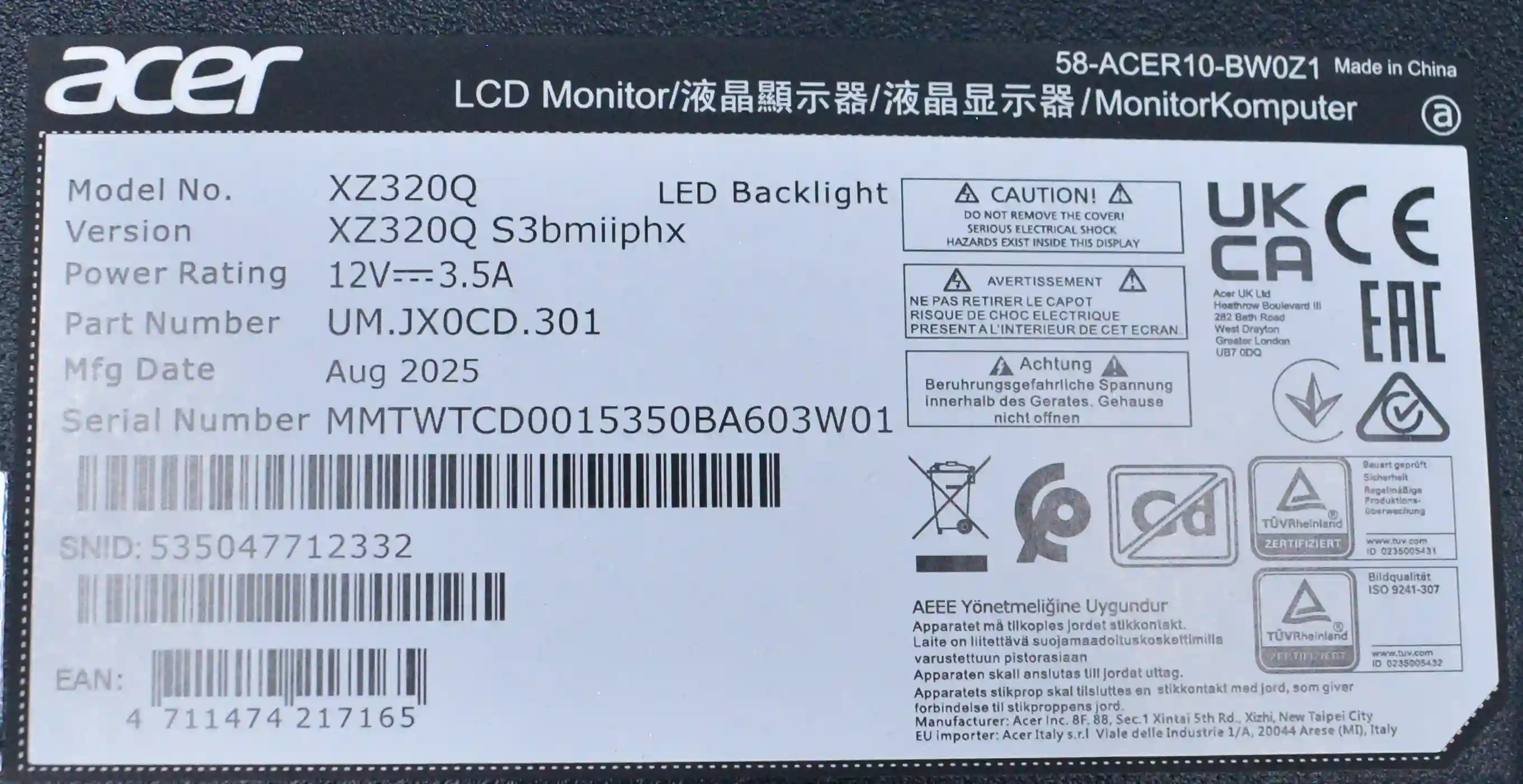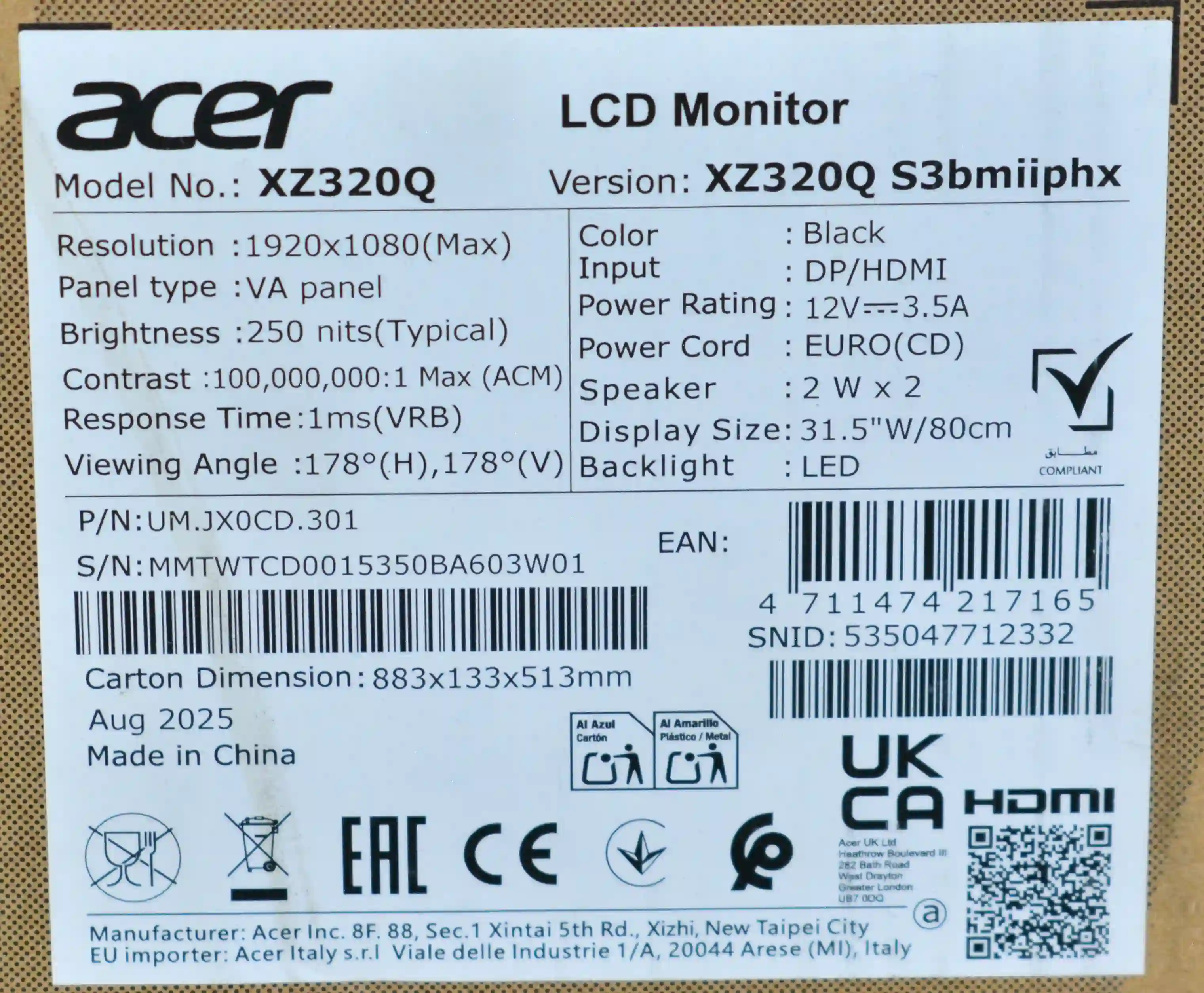 Монитор ACER XZ320QS3bmiiphx 31.5" (UM.JX0CD.301) k4 000091087