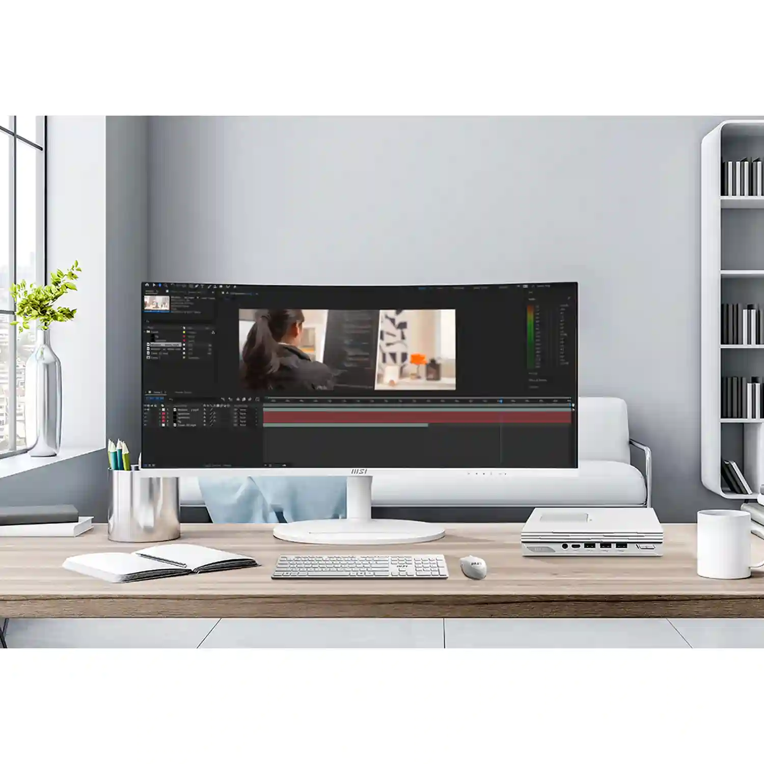 Монитор MSI Modern MD342CQPW — это уникальное сочетание функциональности и стильного дизайна. Эта элегантная модель в белом цвете с изогнутым экраном идеально впишется в современный офис или домашнее рабочее пространство.