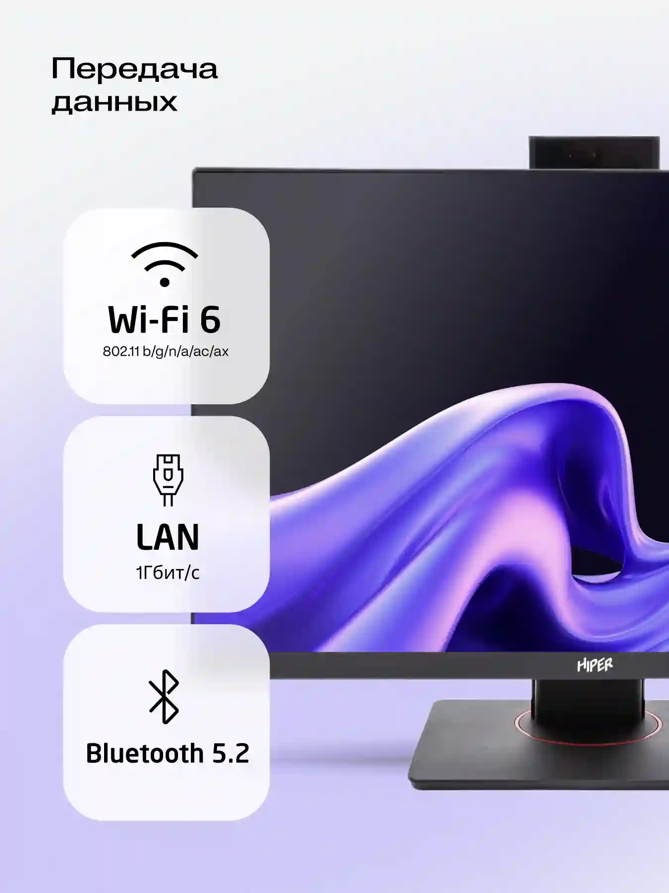 Моноблок поддерживает подключение к интернету через Ethernet-порт или Wi-Fi, что позволяет быстро и стабильно выходить в сеть.