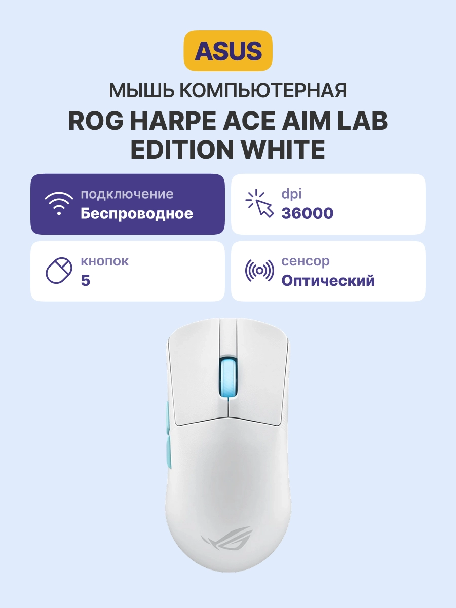 ROG Harpe Ace Aim Lab Edition — это ультралёгкая беспроводная игровая мышь весом 54 грамма. Она оснащена оптическим сенсором ROG AimPoint с разрешением 36 000 DPI, беспроводной технологией ROG SpeedNova и тремя интерфейсами подключения. Мышь оборудована микропереключателями ROG и пятью программируемыми кнопками. Также предусмотрена возможность оптимизации настроек с помощью Aim Lab Settings Optimizer.