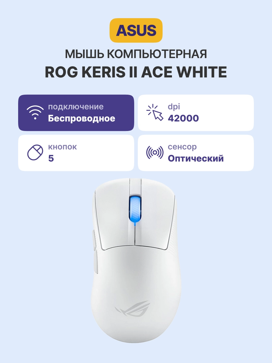 Мышь ROG Keris II Ace представляет собой беспроводную игровую мышь, оснащенную оптическим сенсором ROG AimPoint Pro. Этот сенсор обеспечивает высокую скорость отслеживания до 750 IPS и разрешающую способность до 42 000 DPI, а также поддерживает ускорение до 50G.
