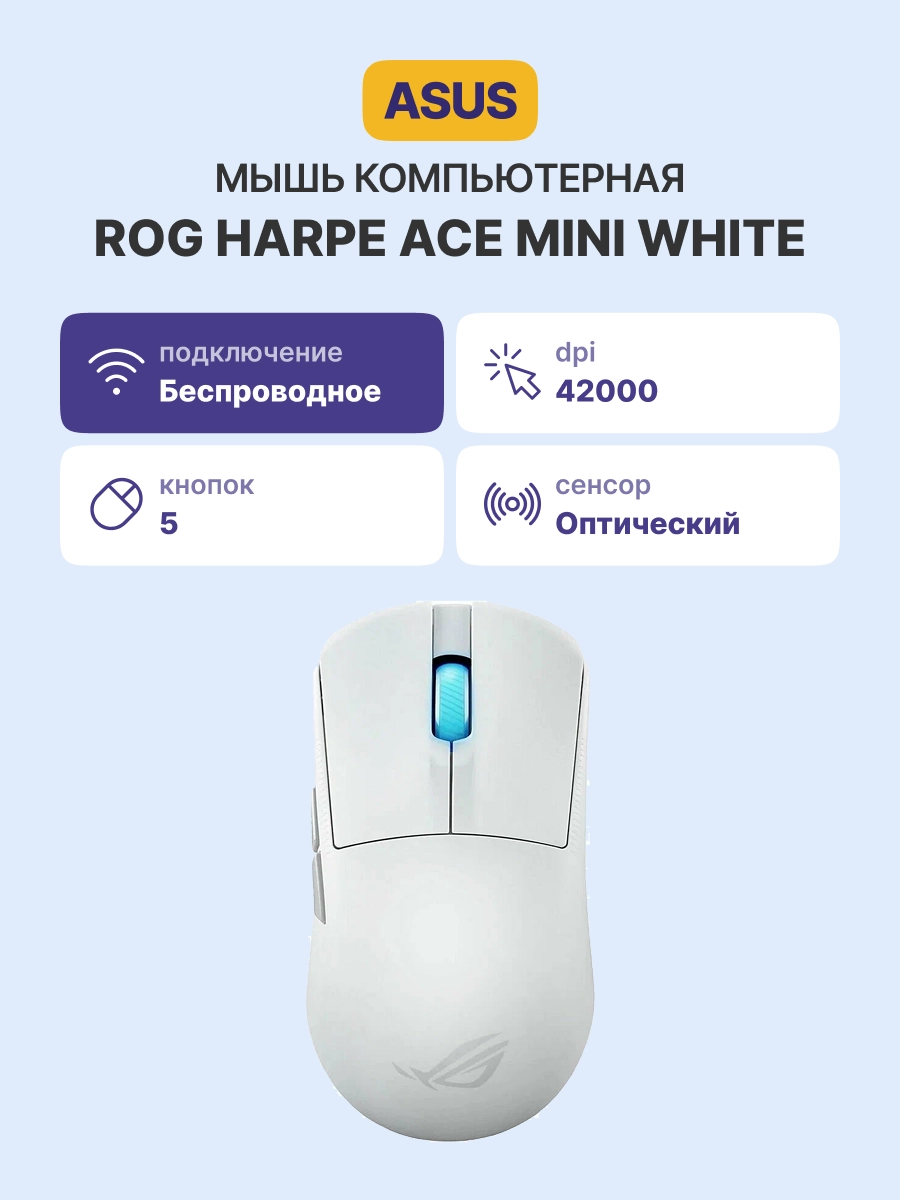 ROG Harpe Ace Mini — это сверхлёгкая игровая мышь весом всего 49 граммов, симметричная форма которой одобрена профессиональными игроками в FPS. Мышь оснащена оптическим сенсором ROG AimPoint Pro с разрешением 42 000 DPI и оптическими микропереключателями ROG. Благодаря беспроводной технологии SpeedNova и частоте беспроводного опроса до 8 000 Гц (совместима с усилителем частоты опроса ROG Polling Rate Booster), эта мышь обеспечивает высокую производительность.