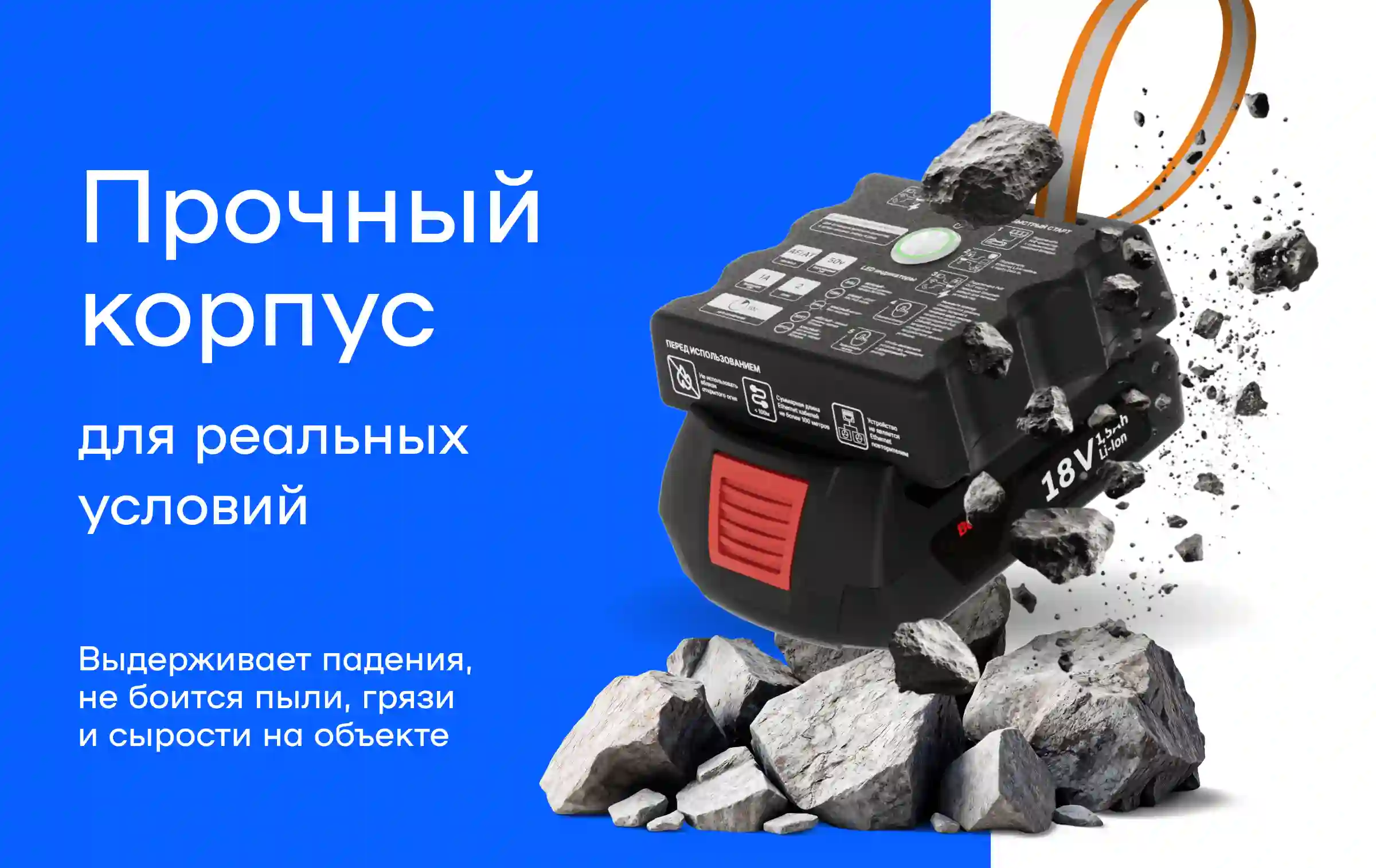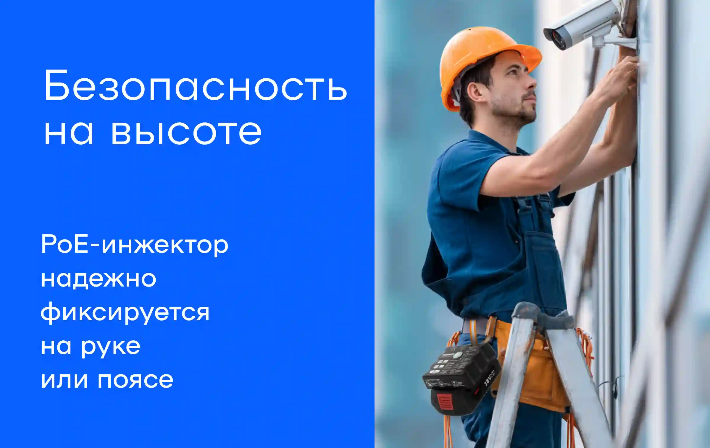 Прочный корпус выдерживает падения с рабочих высот, не боится пыли и влаги. PoE-инжектор фиксируется на руке или поясе, управление сведено к одной кнопке и рассчитано на работу в перчатках.