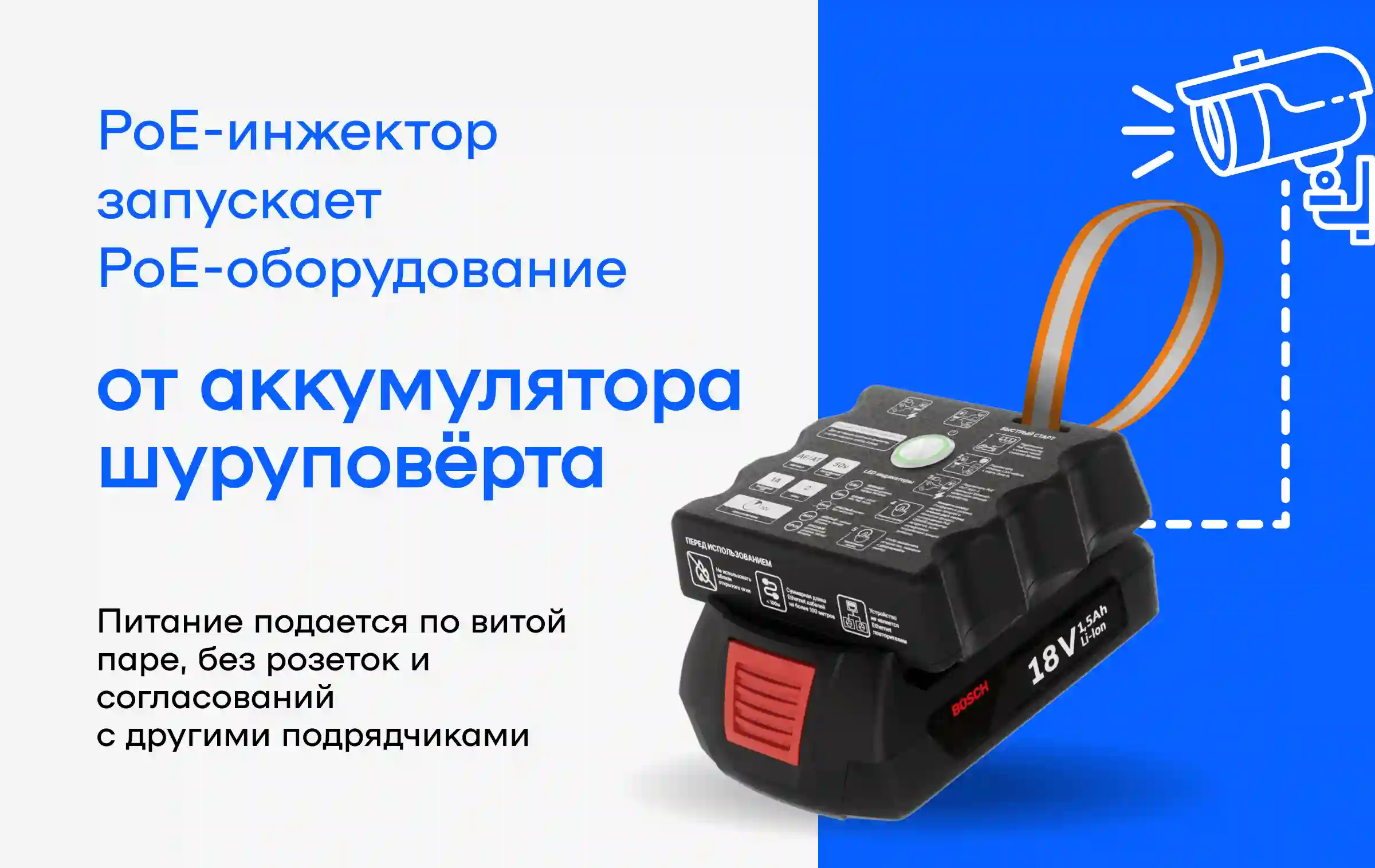 Портативный PoE-инжектор — автономный инструмент для монтажа и диагностики PoE-оборудования в любых условиях. Он работает от стандартных аккумуляторов для шуруповерта и подаёт питание прямо по витой паре. Даже если на объекте нет розеток и электросеть ещё не сдана, вы сможете смонтировать, проверить и показать заказчику готовое решение.