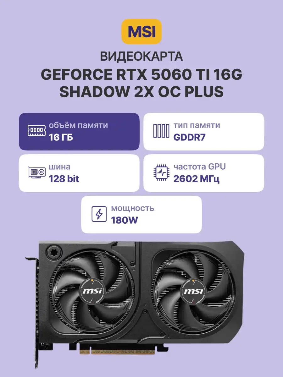 Видеокарта MSI GeForce RTX 5060 Ti 16G SHADOW 2X OC PLUS представляет собой современное и мощное решение для геймеров и профессионалов, требующих высокой производительности графики. Эта видеокарта оснащена передовыми технологиями, обеспечивающими потрясающую графику и высокую производительность в играх и приложениях. Она идеально подходит для тех, кто стремится к максимальной производительности и качеству изображения.