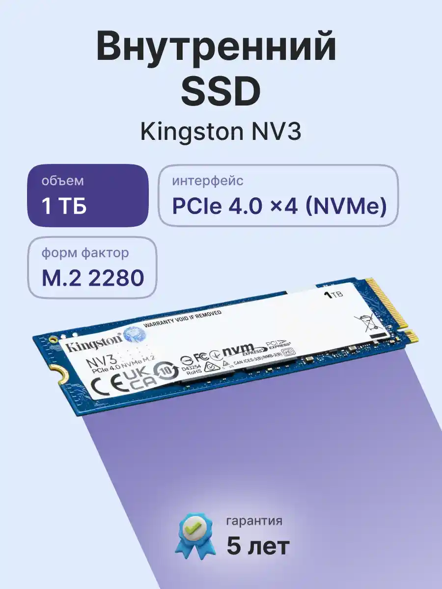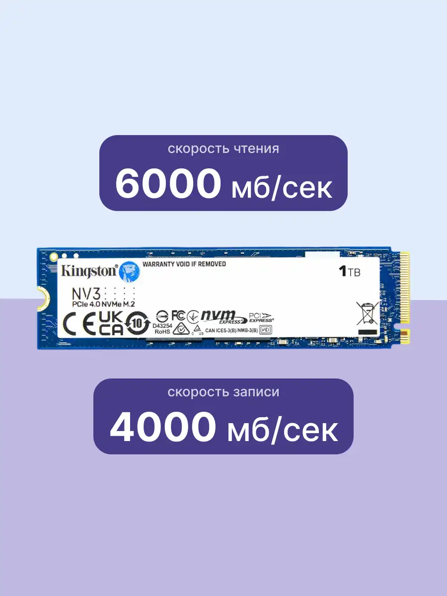 Kingston NV3 PCIe 4.0 NVMe SSD — это новое решение для хранения данных на основе контроллера NVMe Gen 4x4, обеспечивающее скорость чтения/записи до 6000/5000 МБ/с1. Новый SSD-накопитель обеспечивает более низкое энергопотребление и снижает нагрев, оптимизируя производительность вашей системы без ущерба для ее эффективности. Компактная односторонняя конструкция M.2 2280 (22x80 мм) позволяет увеличить объем памяти до 4 ТБ2,3, сохраняя место для других компонентов. Оцените скорости NVMe с помощью NV3.