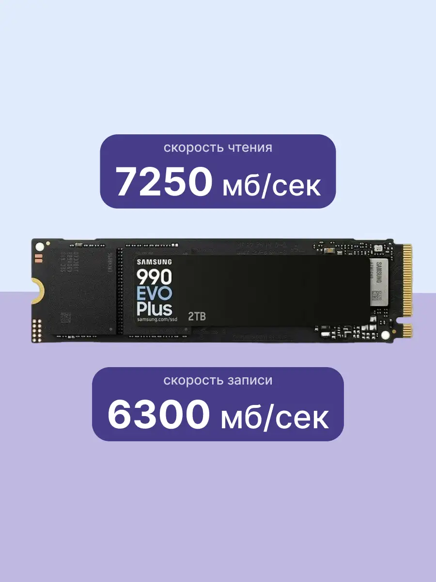 Samsung SSD 990 Plus обладает впечатляющей скоростью чтения до 7250MB/s и скоростью записи до 6300MB/s, что делает его идеальным для задач, требующих высокой скорости обработки данных. Использование технологии V-NAND TLC и поддержка NVMe 2.0 обеспечивают высокую производительность и эффективность работы.