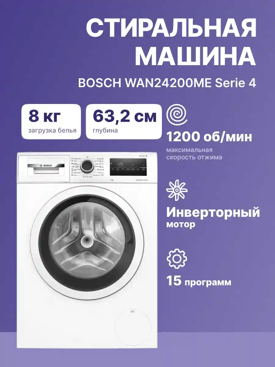 Стиральная машина Bosch WAN24200ME Serie 4 — это идеальное решение для современной семьи, объединяющее высокую эффективность, надежность и современные технологии в элегантном дизайне. С фронтальной загрузкой и вместимостью 8 кг, она отлично справляется с самыми разными загрузками — от повседневного стирки одежды до объемных одеял и подушек.