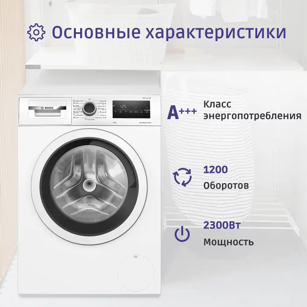 Стиральная машина Bosch WAN24200ME соответствует классу А+++, что позволяет существенно сократить ваши расходы на электроэнергию. Больше не нужно переживать о высоких счетах за электричество — Bosch Serie 4 помогает вам заботиться не только о чистоте вашего белья, но и об окружающей среде.