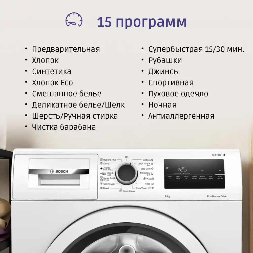 Стирка становится легче и комфортнее благодаря 15 различным программам. Вы можете выбрать оптимальный режим для любого типа ткани и степени загрязнения, начиная от деликатного ухода за шёлком и заканчивая мощной стиркой для спортивной одежды. Класс стирки А гарантирует отличные результаты, а класс сушки B обеспечивает достойное качество отжима.