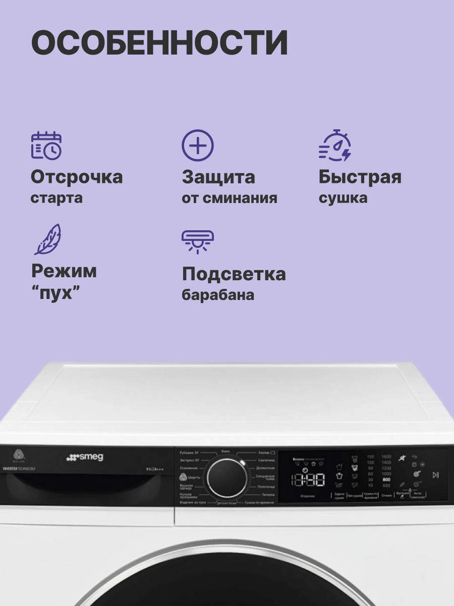 Техника оборудована инверторным мотором и барабаном из нержавеющей стали, что обеспечивает долговечность и надежность работы. Внутреннее освещение помогает контролировать процесс сушки. Диаметр загрузочного люка составляет 38 см, а угол открывания двери — 160°, что облегчает загрузку и выгрузку белья.