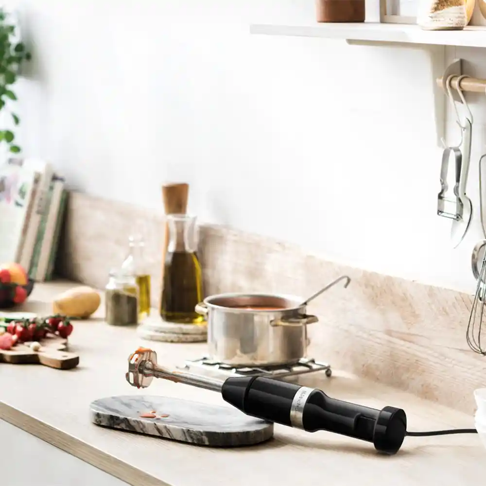 Управляйте скоростью одним пальцем, чем сильнее нажатие - тем выше обороты. Создавайте текстуру блюд с крупными кусочками или превращайте ингредиенты в нежное однородное пюре.