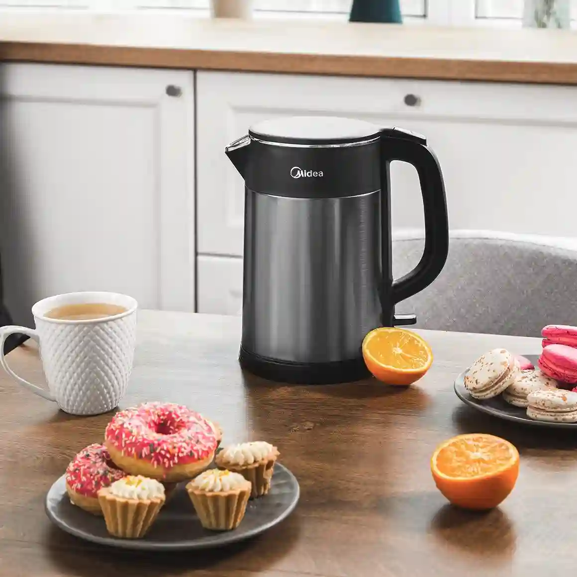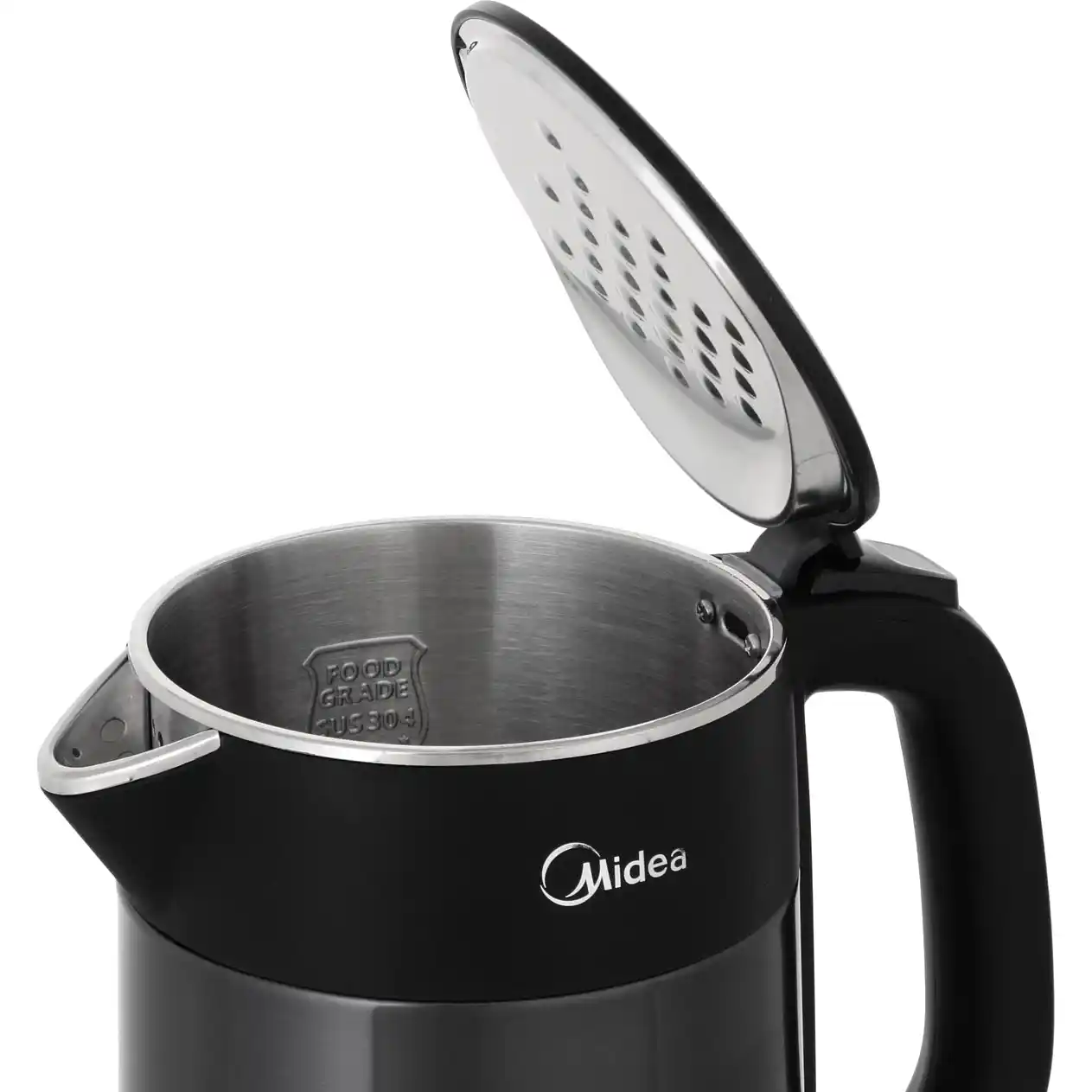 Чайник Midea MK-8076 - двойные стенки из нержавеющей стали, цельная колба, объем 1.5 л, мощность 2200 Вт, индикатор включения, сматываемый шнур, цвет корпуса черный.