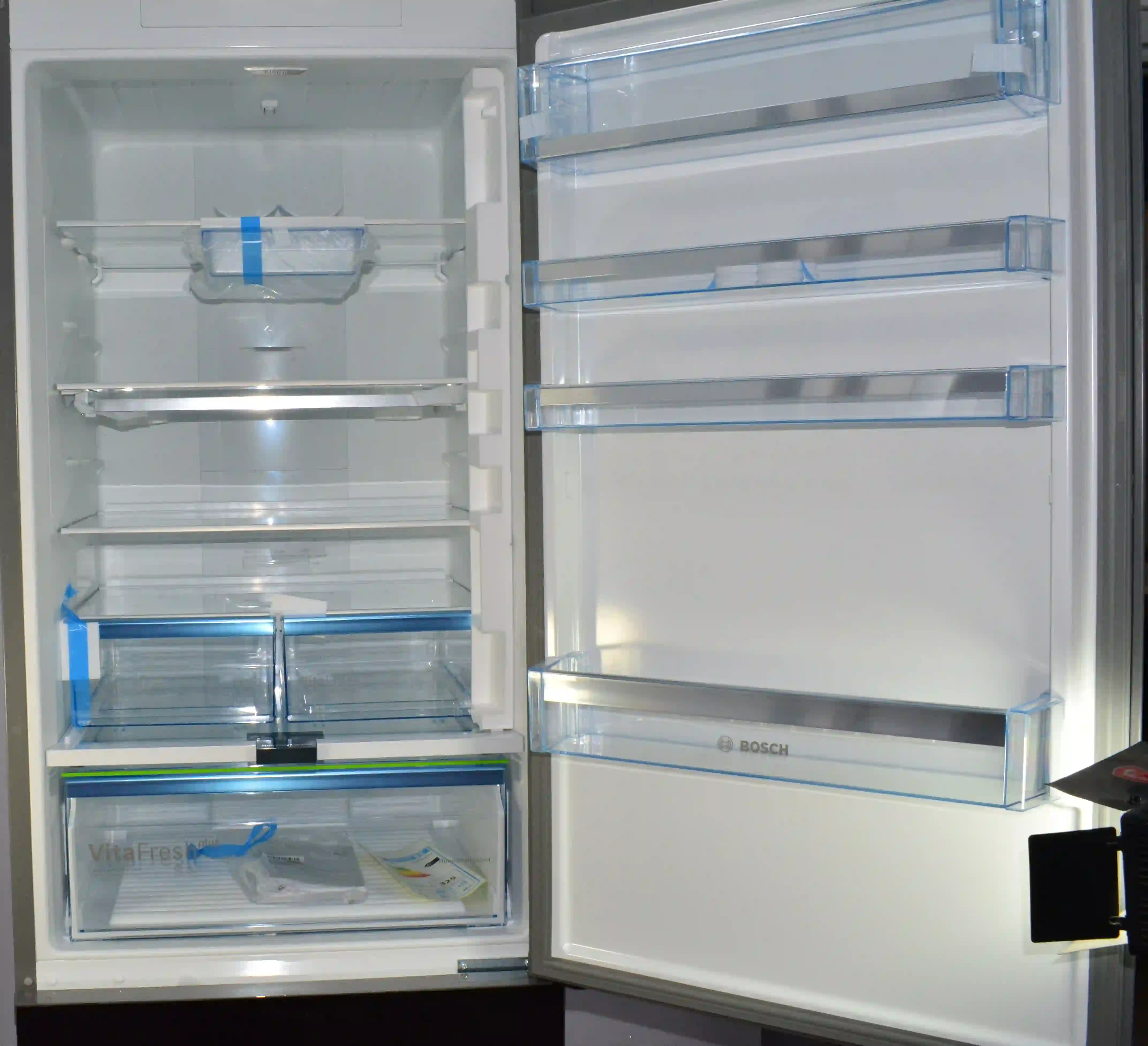 Дополнительные удобства включают отделение для молочных продуктов и подвесную полку на 5 бутылок, что позволяет организовать пространство максимально эффективно. Хромовые аппликации придают интерьеру нотку утонченности. Нулевые зоны VitaFresh plus обеспечивают идеальные условия для хранения фруктов, овощей и мяса, поддерживая оптимальную влажность и температуру. Уровень шума в 42 дБ делает его достаточно тихим для использования в открытых планировках и кухнях. Боковое LED освещение и точечное освещение для зон свежести делают поиск необходимых продуктов очень удобным, а полки EasyAccess обеспечивают легкий доступ к продуктам.