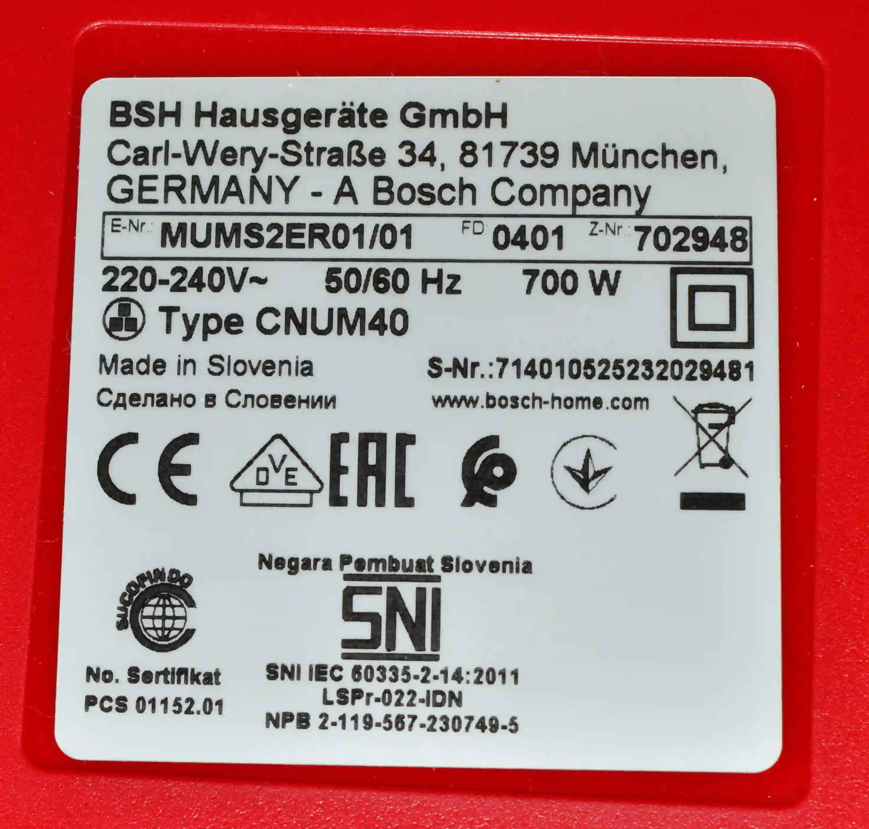 Кухонный комбайн BOSCH MUMS2ER01, красный k6 000070411