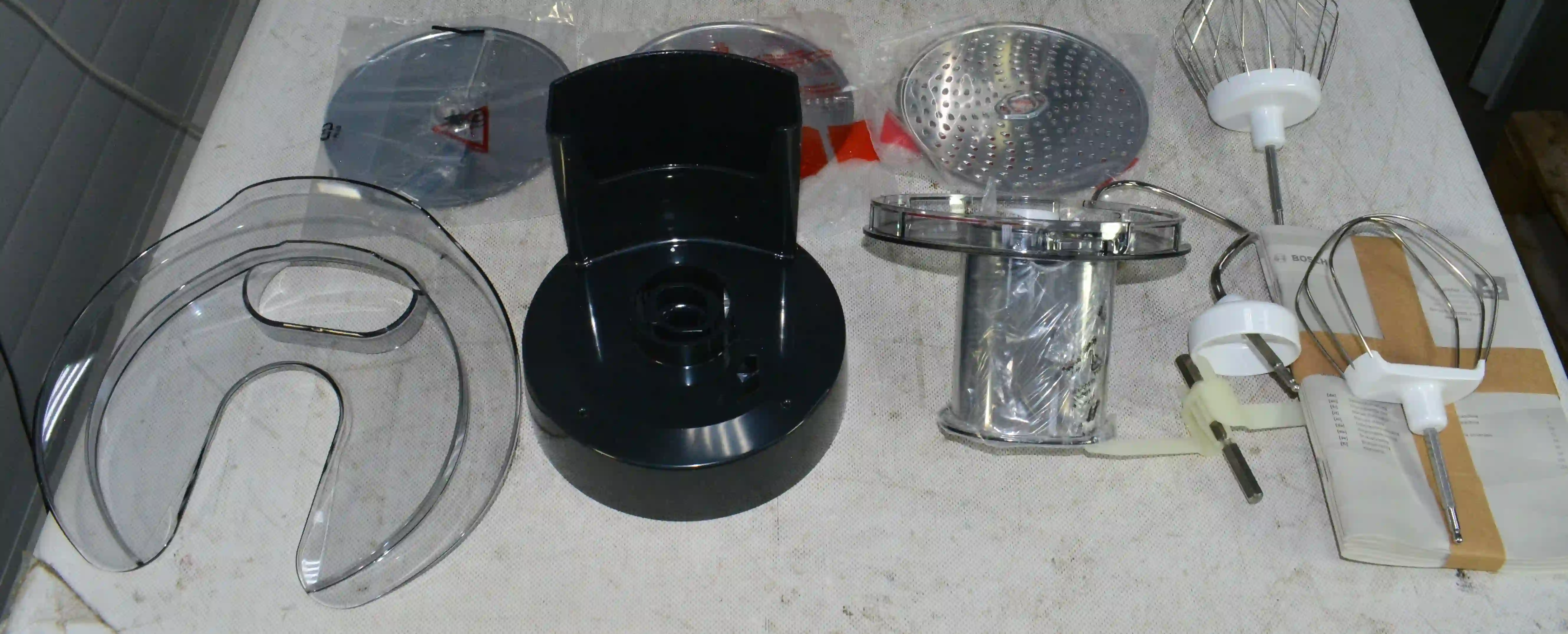 В комплекте идут различные насадки, включая крюк для теста, венчики и режущие диски, которые расширяют возможности прибора. Все аксессуары легко моются, в том числе в посудомоечной машине, что упрощает уход.