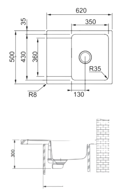 Габариты мойки — 620×500 мм, а размеры чаши — 430×350 мм с глубиной 180 мм, что обеспечивает достаточно места для комфортного мытья посуды. Такие размеры делают мойку универсальной для большинства кухонных гарнитуров.
