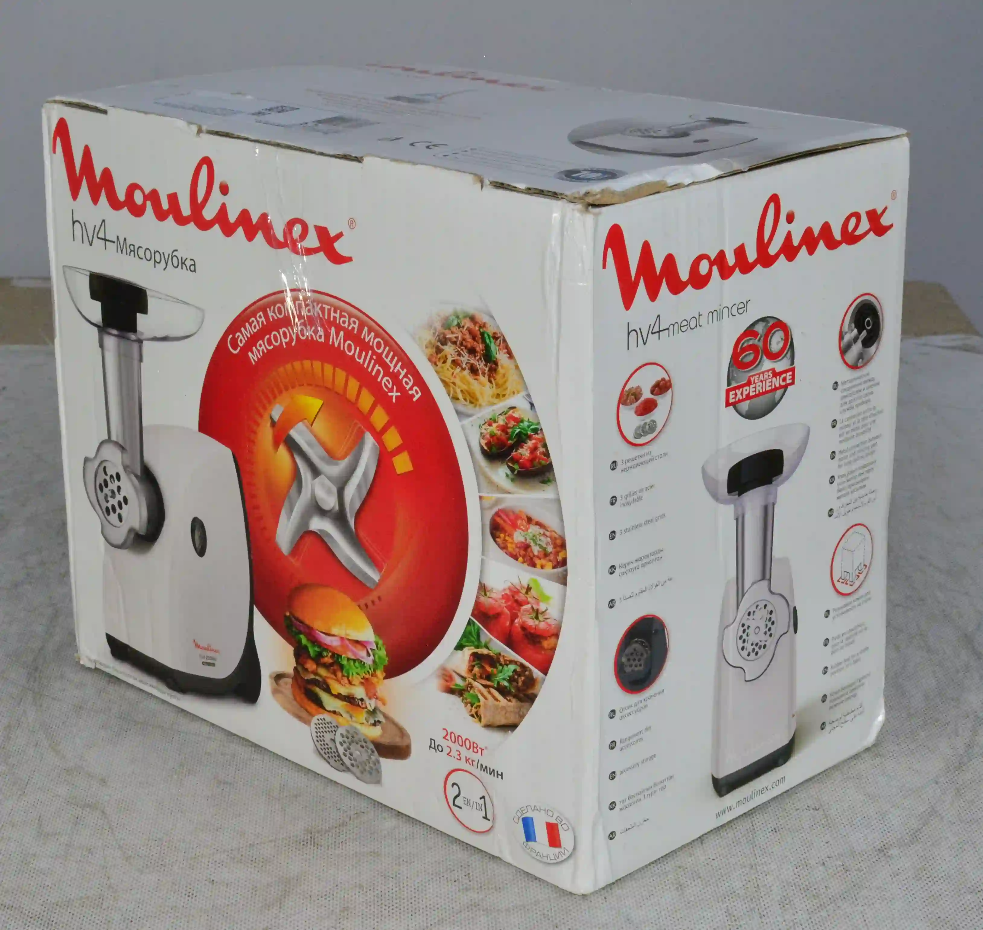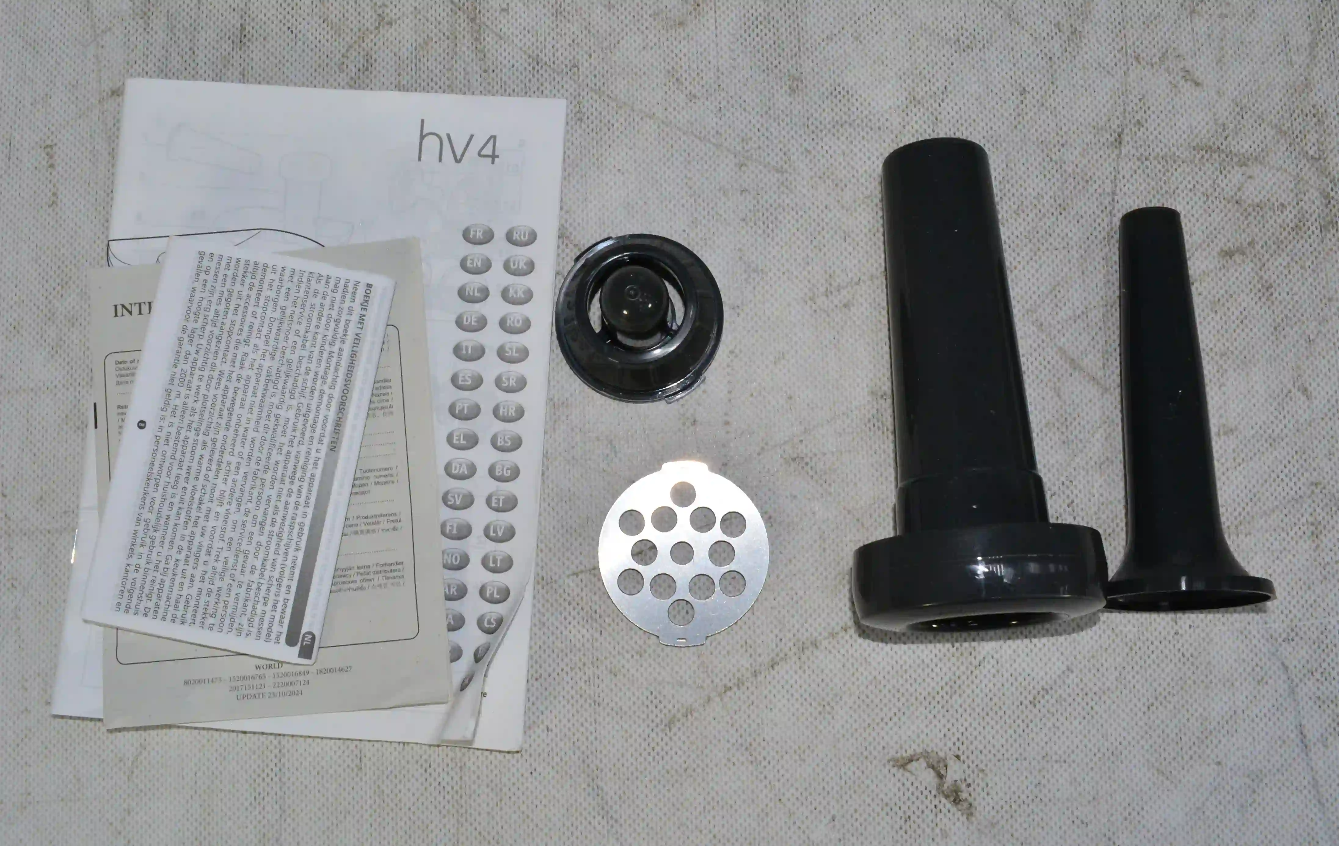Комплектность: Толкатель, набор насадок, диски для фарша -2шт, нож, документация. (Отсутствует лоток)