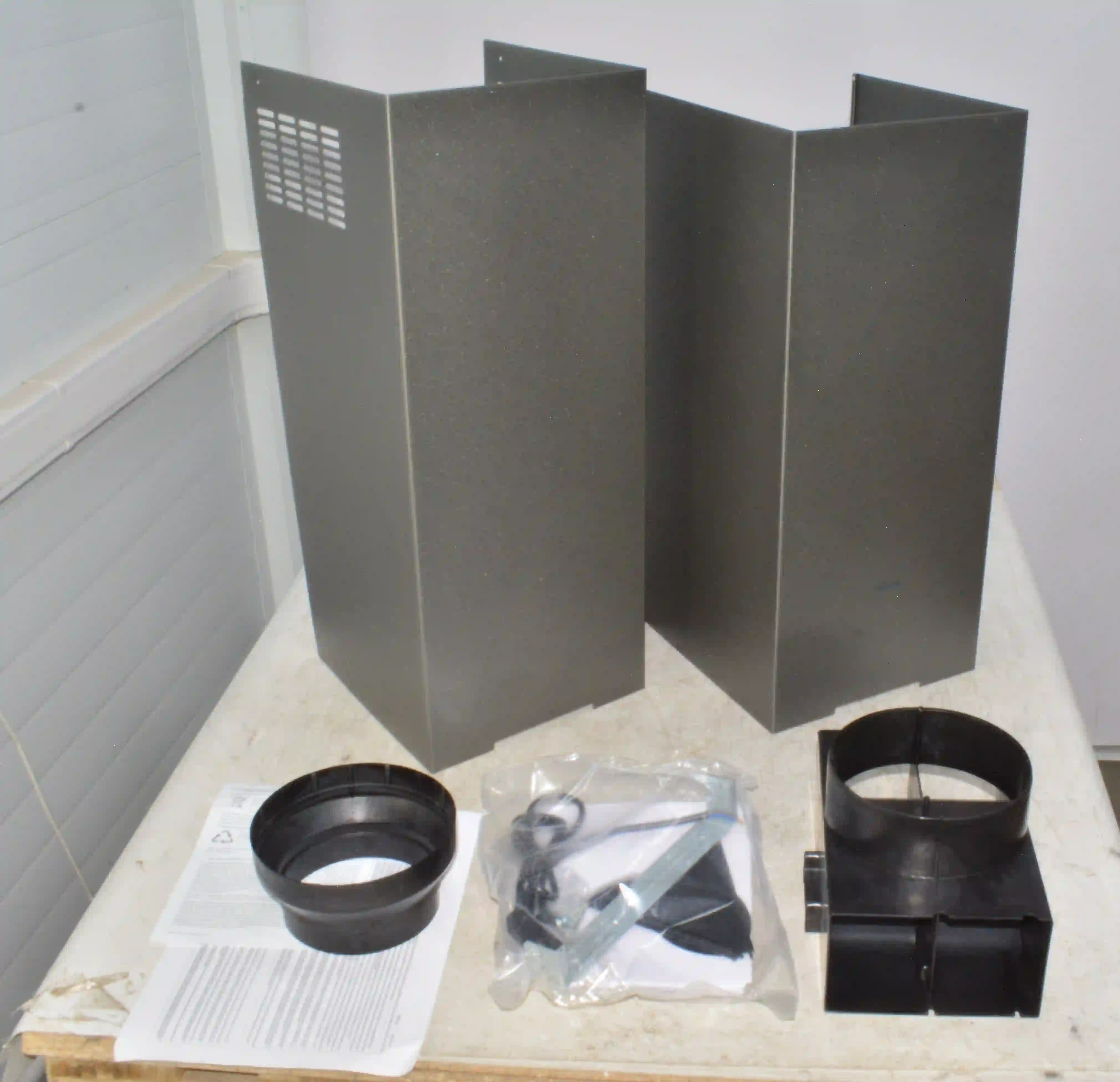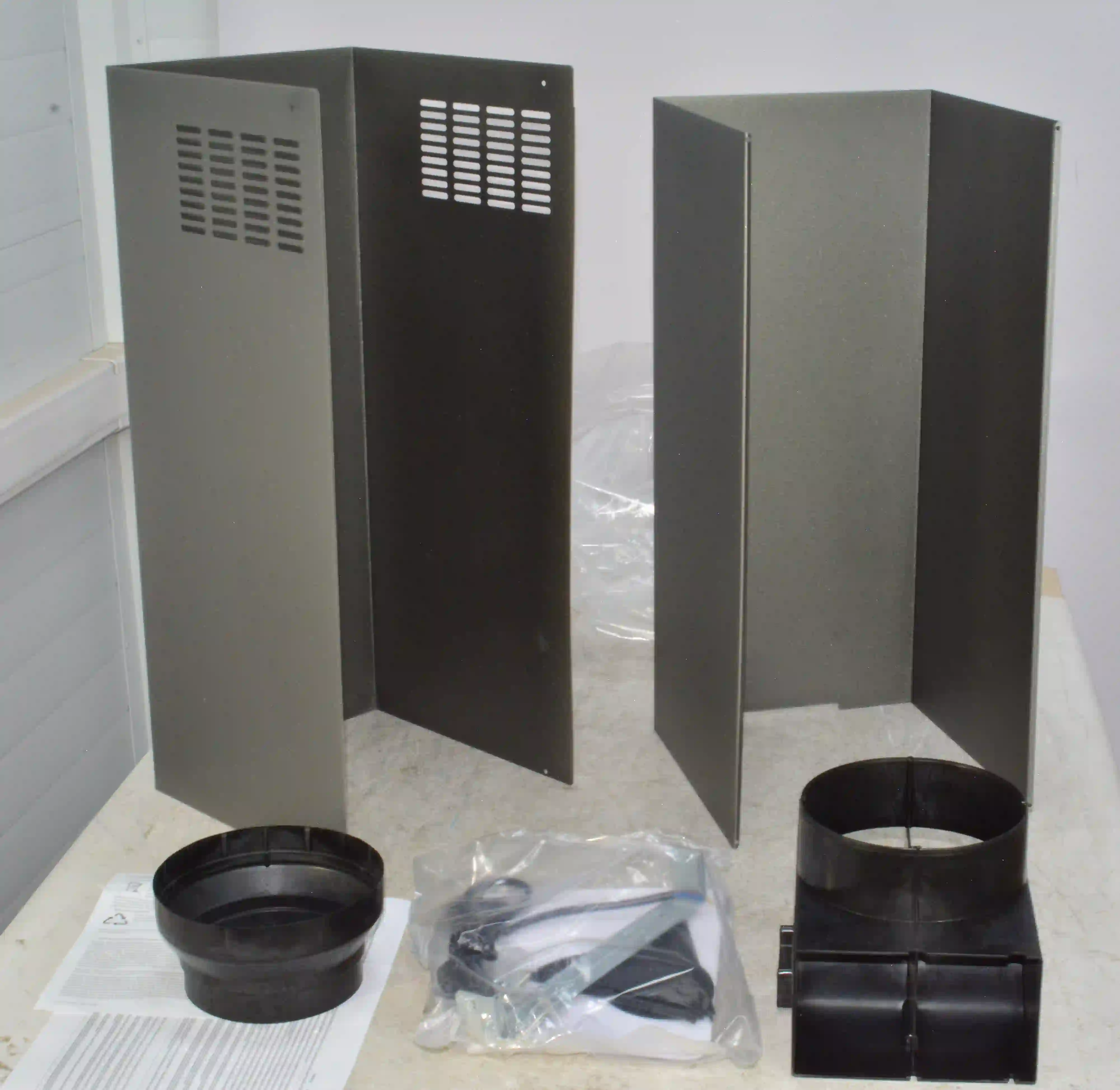 Комплектность: Вытяжка каминная ,документация,кабель питания(без вилки),пластиковый кожух 2 шт,пластиковые заслонки 2 шт,металлический кожух 2 шт