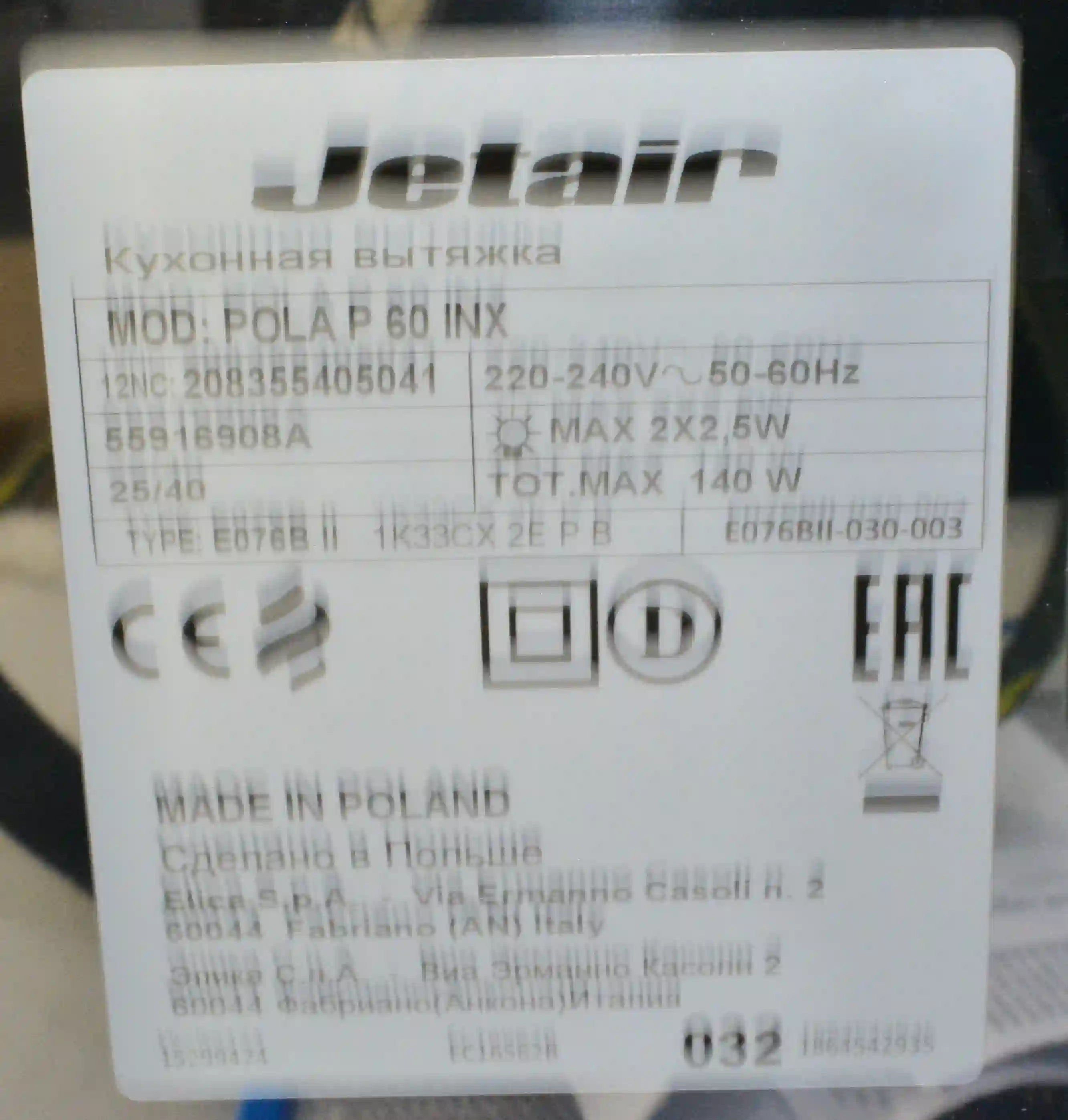 Вытяжка каминная JET AIR POLA P 60 INX-55916908A k4 000082309