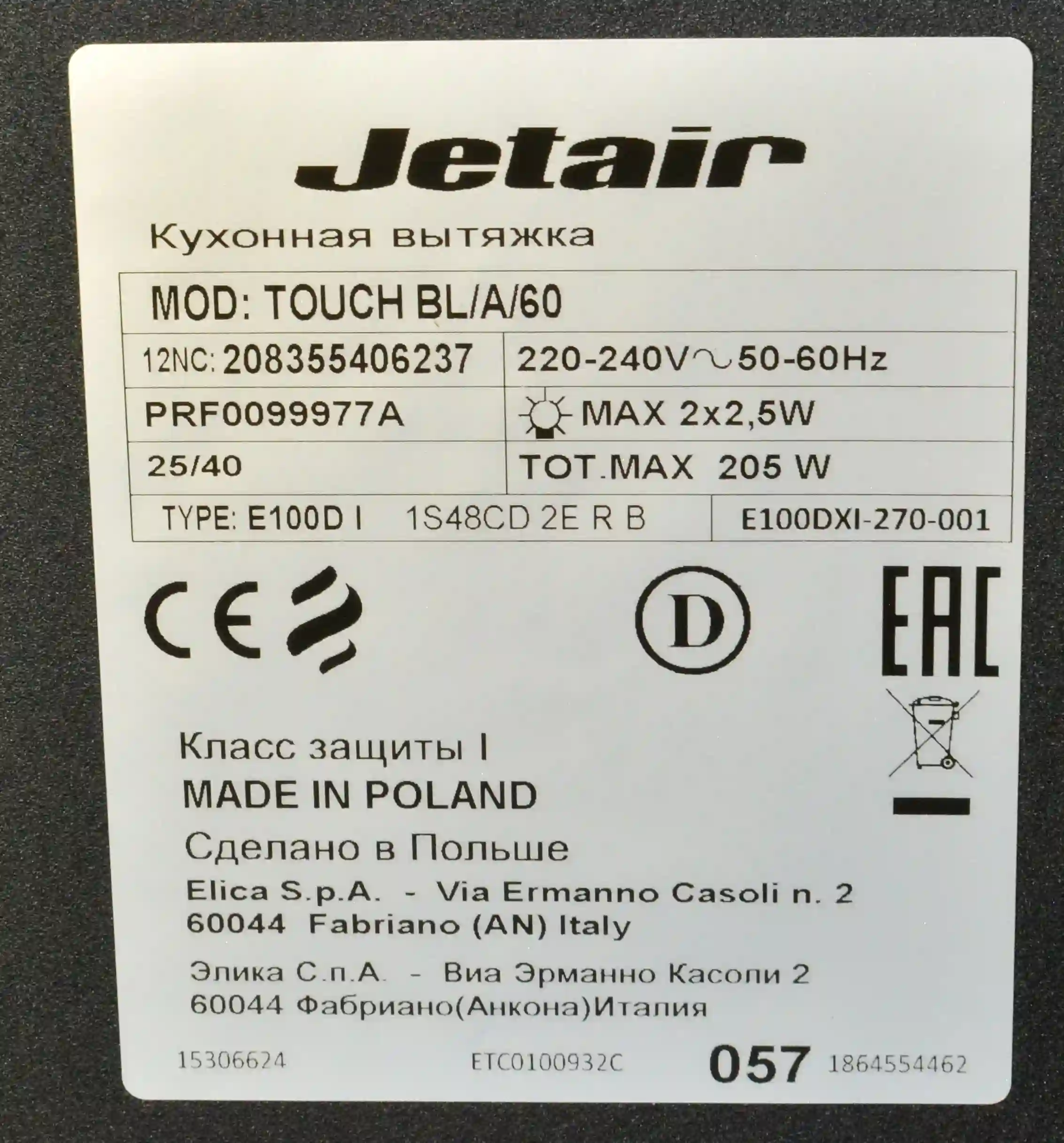 Вытяжка каминная JET AIR TOUCH BL/A/60-PRF0099977A k6 000088478